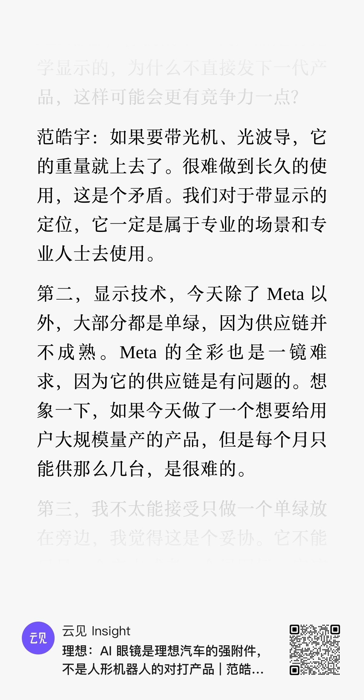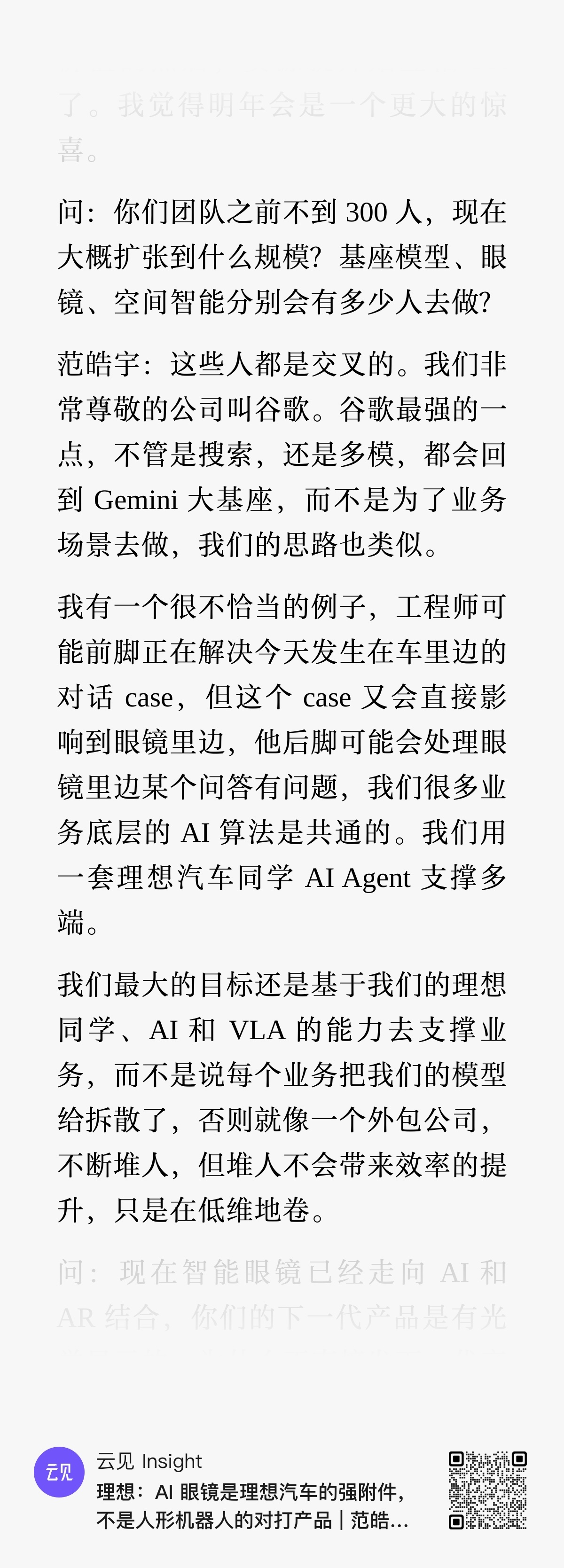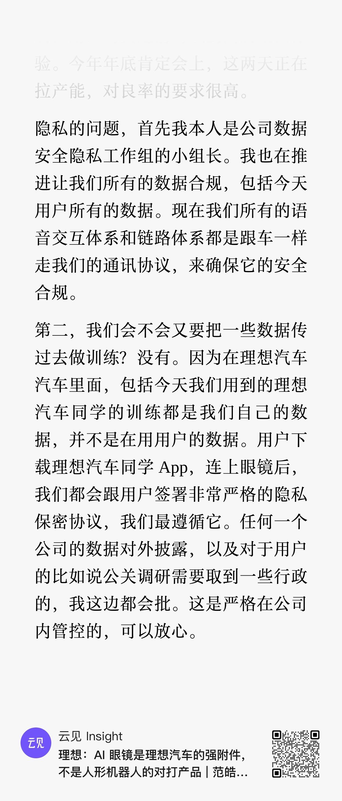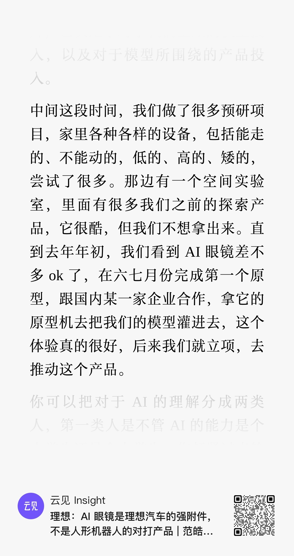 看了云见对理想AI眼镜的主题专访,原文很长,简单总结: - 理想AI眼镜第一代不带显示,第二代带显示,第三代脱离手机使用; - 理想做了很多产品的预研,并且设立了穿戴机器人部门,因为AI眼镜供应链成熟,所以就先发了眼镜; - 为什么第二代才带显示,因为现在的显示只有绿色,而且也不太成熟; - 理想的AI是基座,复用在座舱、眼镜等各场景中; - 理想十分注重用户隐私,既不会拿来做训练,也会严格保密。想要了解更多,可以点图片查看。