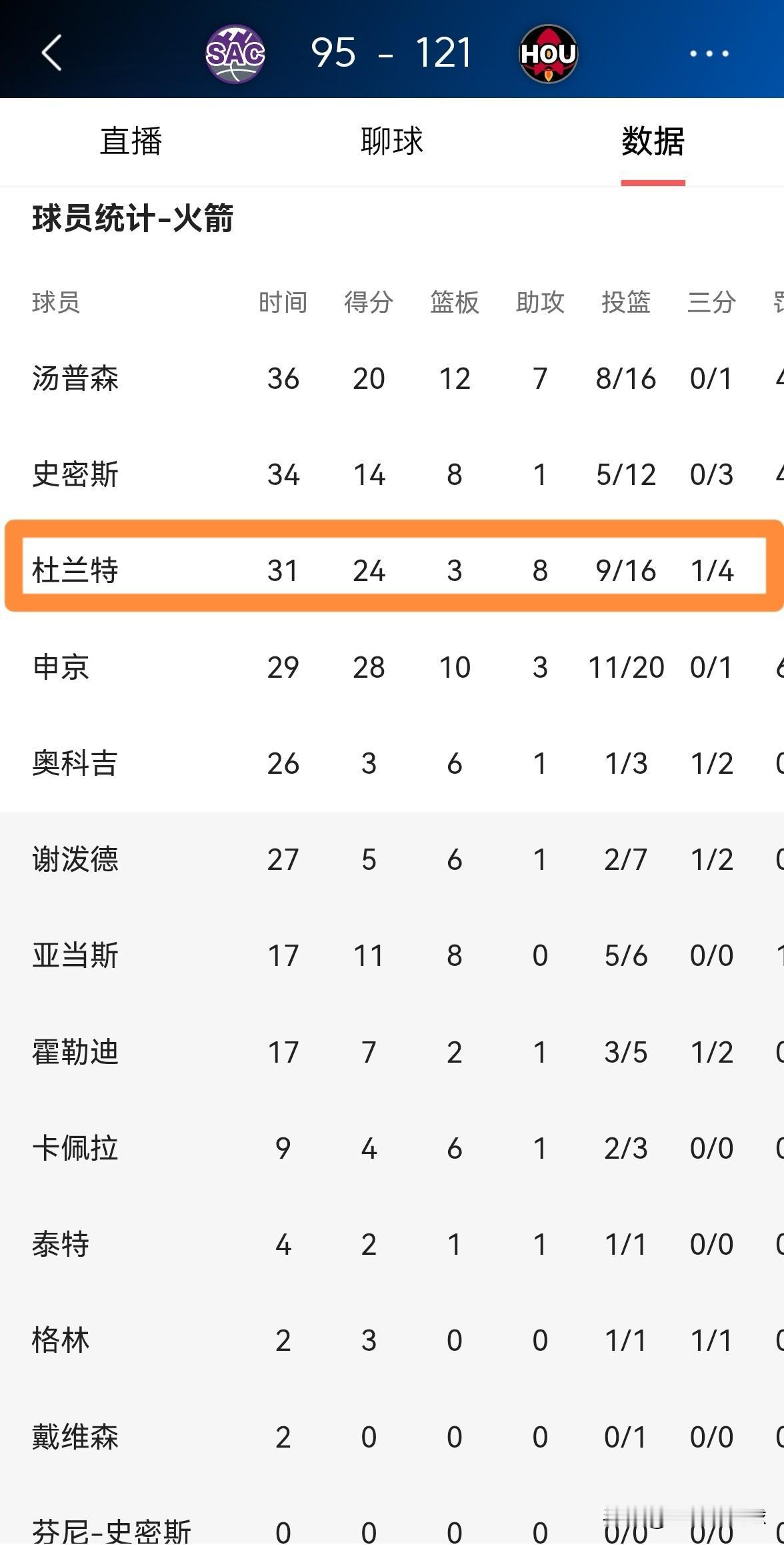 火箭超级巨星杜兰特真是太遗憾了!在今天火箭主场以121:95大胜国王的比赛中,手感滚烫的杜兰特首发出战31分钟,投篮16中9,其中三分球4中1、罚球5中5得到24分3篮板8助攻。值得一提的是,本场比赛过后杜兰特的职业生涯总得分来到了30996分,距离31000分大关仅差4分。如果杜兰特能够多上场2分钟的话,我相信杜兰特一定能够在今天迎来生涯的里程碑时刻,可惜的是这个时刻要等到下一场比赛才能实现了。
