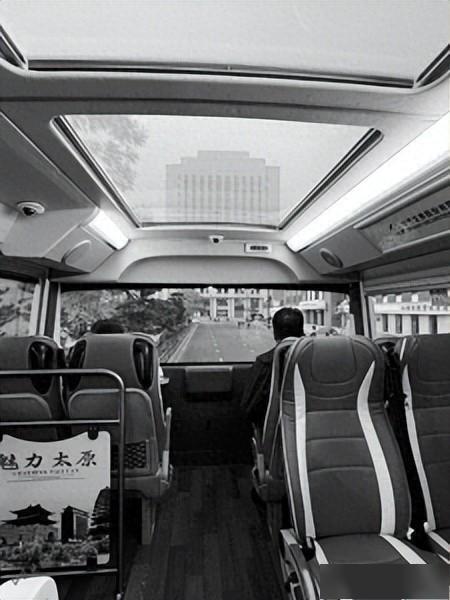 巴士二层则主打观景体验,采用卡座式散座布局,搭配高档真皮座椅,显著提升了乘坐舒适度,让乘客能够在放松的状态下欣赏城市美景。二层顶部配备了全景可变玻璃天窗,支持磨砂与透明状态自由切换——在透明模式下,乘客可“360度”无死角俯瞰城市景观,沉浸式感受太原地标风貌;当需要私密空间时,切换至磨砂模式即可,完美适配不同场景需求。此外,二层还同步搭载了卡拉OK系统,乘客可在移动观光中尽享欢唱乐趣,打造高品质的娱乐体验。