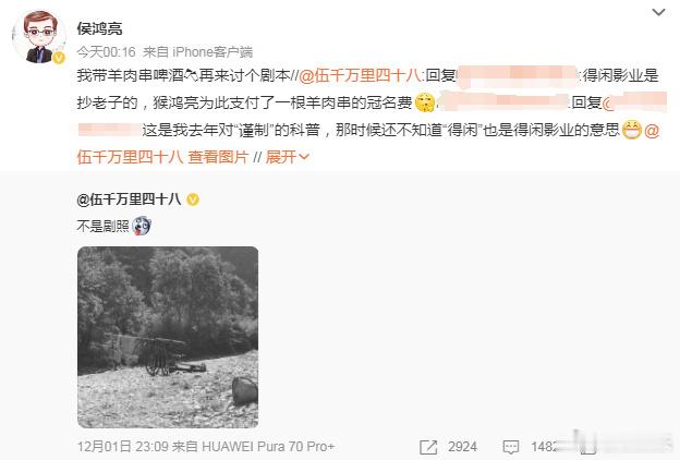 侯鸿亮兰晓龙互动侯鸿亮回应兰晓龙 12月1日,《得闲谨制》编剧兰晓龙回复网友“‘得闲’也是得闲影业的意思”的评论,表示:“得闲影业是抄老子的,猴鸿亮为此支付了一根羊肉串的冠名费”12月4日,转发回应:“我带羊肉串啤酒🍻再来讨个剧本”