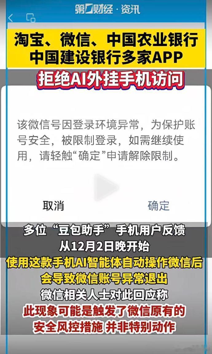 豆包×中兴首款AI手机“豆包助手”确实火了!但首批用户刚到手就懵了,在豆包手机执行微信任务直接被微信踢下线。继微信之后,多个用户均遭遇了支付宝无法正常登陆的情况,与此同时,多家银行app也出现了因检测到屏幕共享而弹窗警告豆包手机(助手)用户的现象。对此微信回应称:我们没特别动作,它可能只是撞上了常规安全风控。支付宝客服回应称: 可能相关操作或者登录环境存在异常,自动触发了风控系统,可以尝试更换设备。豆包回应称:我们权限全透明!每次操作都需用户亲自授权、随时可打断,是合规的实验室功能。这是一场安全底线 VS 便利革命的硬核交锋。是ai手机 VS APP的风控铁律。能否迈出这一步很重要