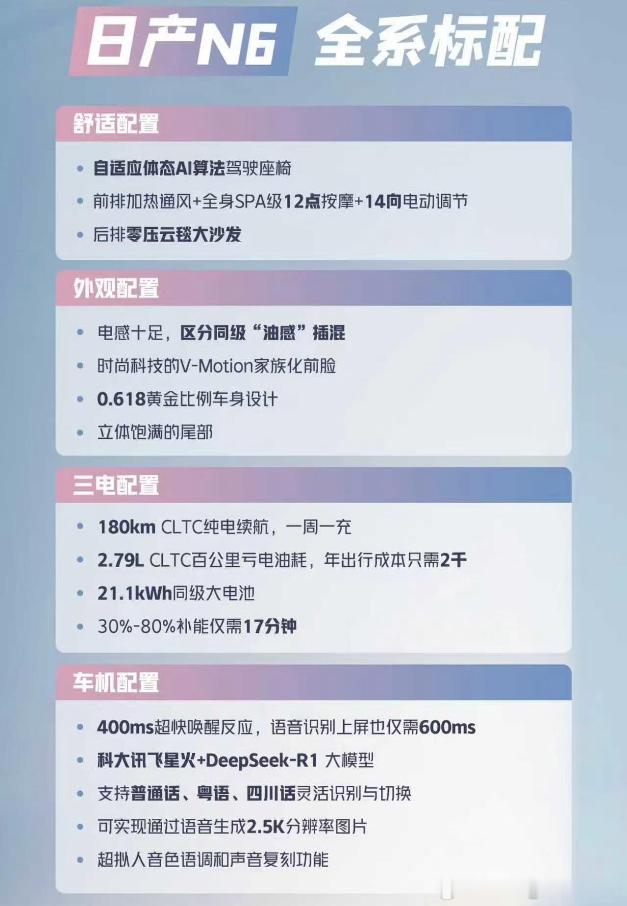 百万级后排大沙发东风日产N6这配置,让别的车企如何应对?CLTC纯电续航180km,21.1kWh大电池,CLTC百公里亏电油耗2.79L,自适应体态AI算法驾驶座椅,带有通风加热+14向电动调节+12点按摩,以上这些都是全系标配,并且限时权益价格只要9.19万元起!东风日产n6