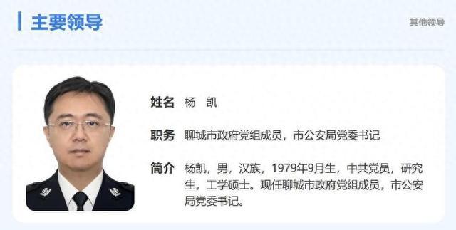 近日,聊城市公安局网站更新领导信息,杨凯已任聊城市政府党组成员,市公安局党委书记。