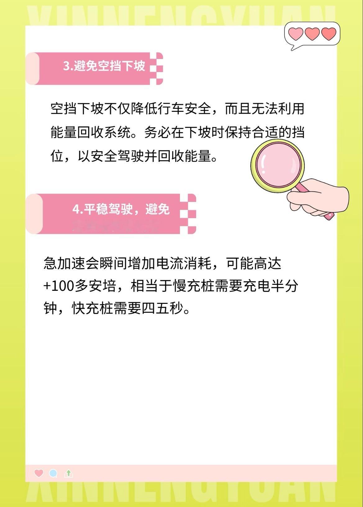 在享受电动汽车带来的环保和经济性的同时,了解一些简单的养护技巧可以帮助您节省电力、延长车辆寿命,并保障行车安全🚘1️⃣合理控制车速根据能源高效原则,电动车在50-80公里/小时的速度区间行驶最为省电。保持这一速度区间不仅有助于节省电量,还能保障行车安全。2️⃣利用能量回收系统许多电动车配备了能量回收系统,可以在下坡或松开油门时将动能转换为电能,从而延长续航。检查车辆的电流显示,如果松开油门时电流指示为-A,说明系统正在回收能量。如果显示为0A,您可能需要轻踩刹车激活回收功能。3️⃣避免空挡下坡空挡下坡不仅降低行车安全,而且无法利用能量回收系统。务必在下坡时保持合适的挡位,以安全驾驶并回收能量。4️⃣平稳驾驶,避免急加速和急减速急加速会瞬间增加电流消耗,可能高达+100多安培,相当于慢充桩需要充电半分钟,快充桩需要四五秒。温和驾驶🛞不仅减少对电机的损害,还能显著降低能耗,延长电池寿命。我与汽车的日常大v聊车