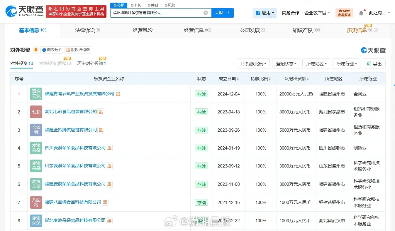 【#盘点塔斯汀商业版图#】#塔斯汀直接持股多家企业#据媒体报道,截至12月2日,塔斯汀在过去90天新开了968家店,但也新关了907家。而塔斯汀当前的在营门店数量是10296家左右,但该品牌未直接回应。#塔斯汀90天关了907家店#记者查询天眼查App显示,福州塔斯汀餐饮管理有限公司成立于2017年12月,法定代表人为杨兵,注册资本约1.2亿人民币,经营范围含餐饮管理、企业管理咨询、信息咨询服务、企业形象策划、市场营销策划、工程管理服务、组织文化艺术交流活动等。股东信息显示,该公司由Tasiting (HK) Holdings Limited全资持股。对外投资信息显示,该公司直接持股10家企业,均为存续状态,包括福建青鸾云筑产业投资发展有限公司、湖北七彩食品包装有限公司、福建金铃狮供应链有限公司等,版图涉及餐饮、金融、科技等。控制企业信息显示,该公司控制14家企业。