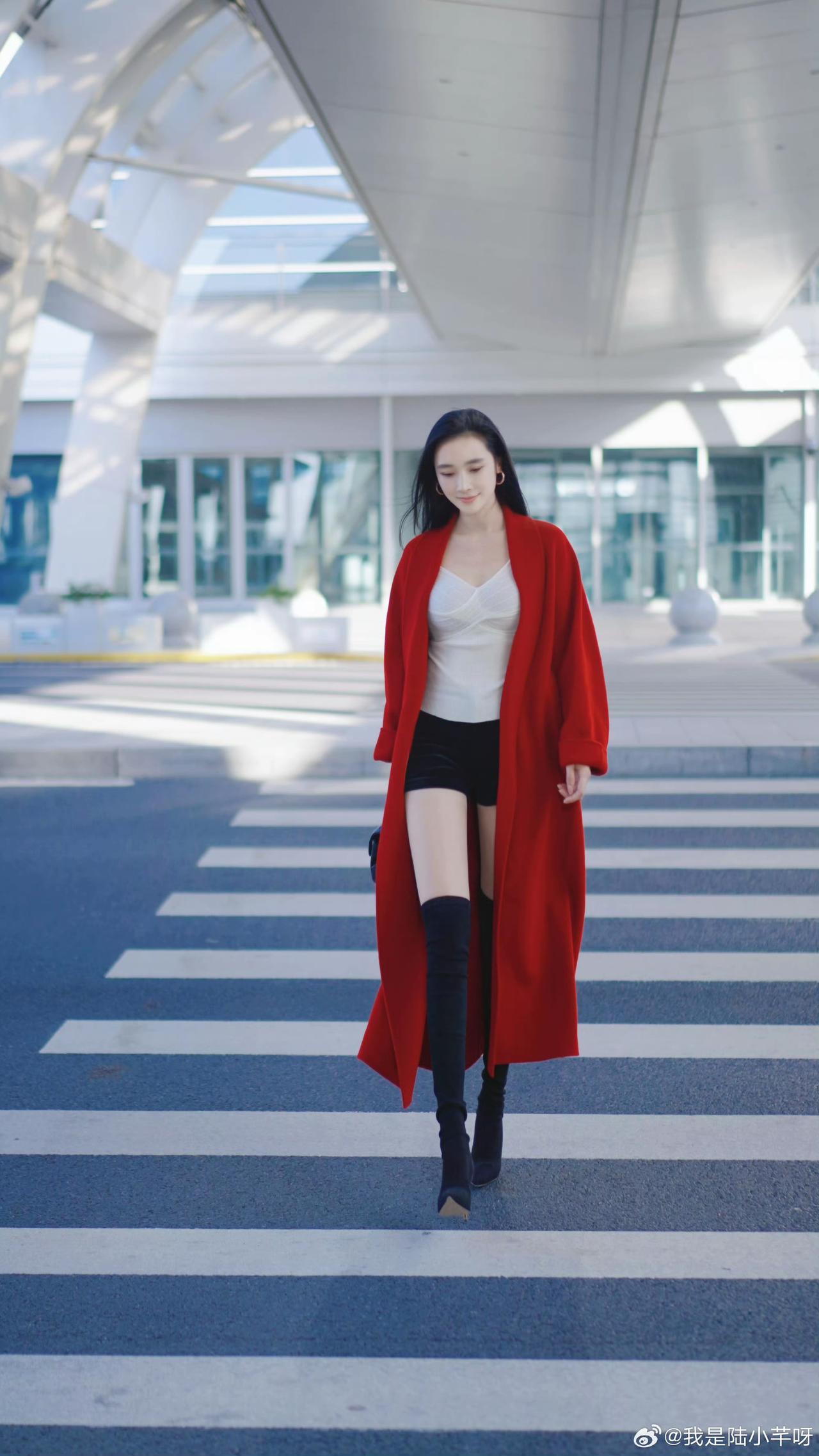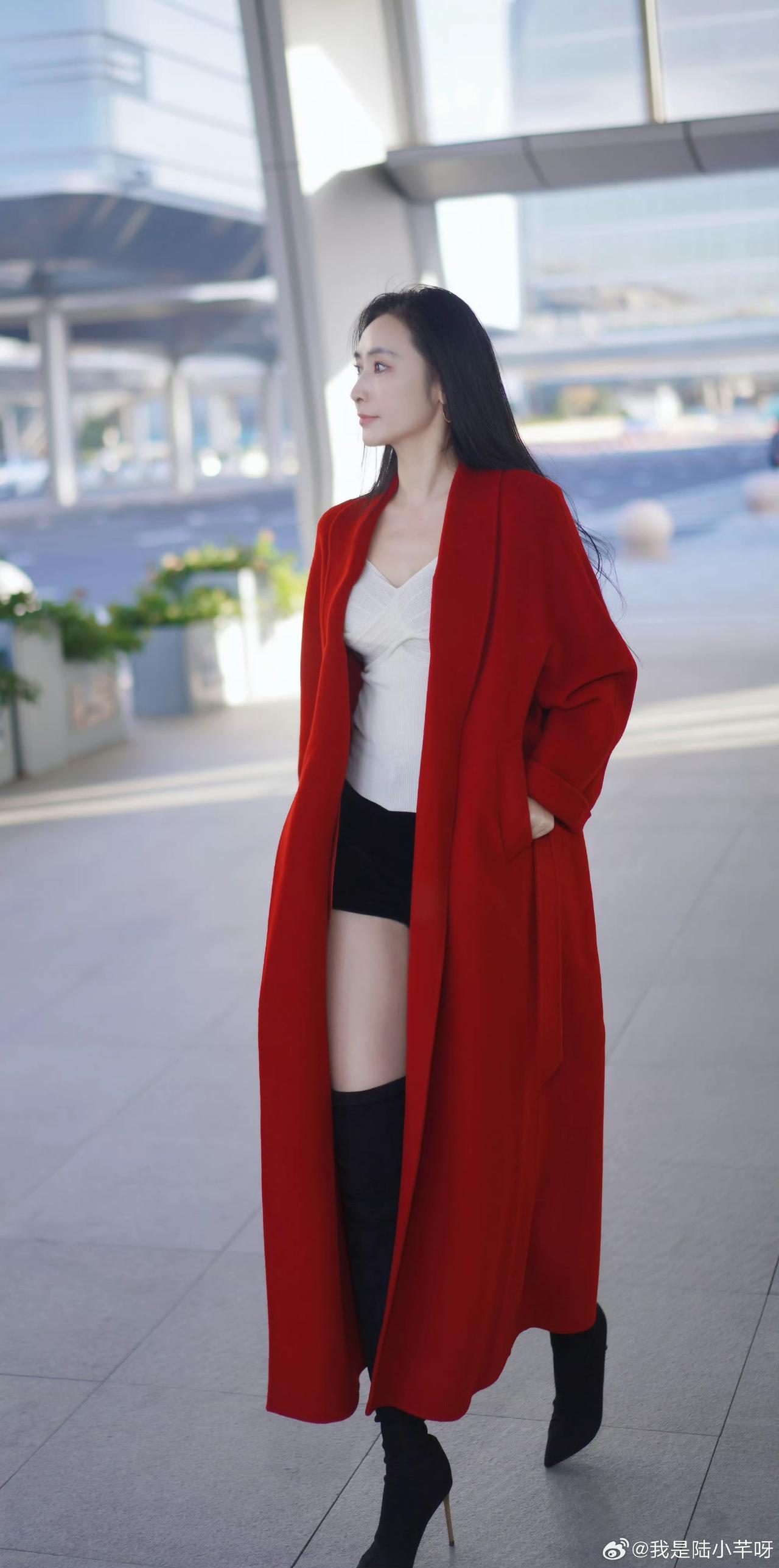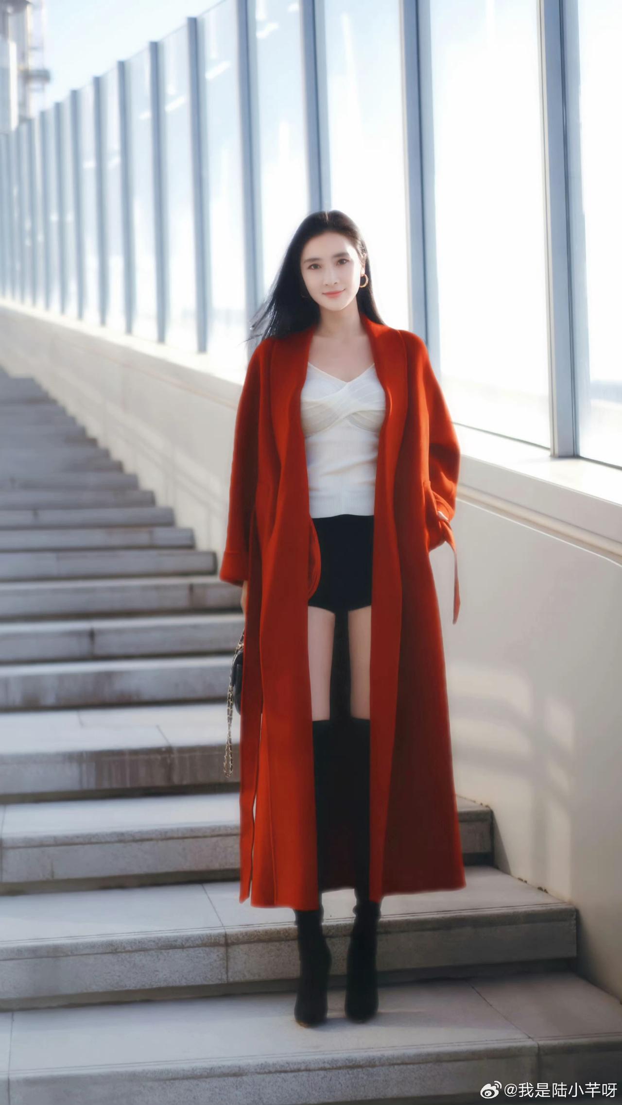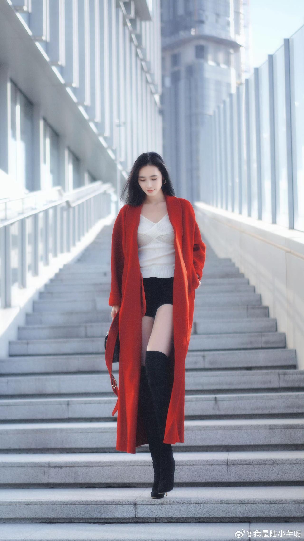 红色大衣搭配黑色短裙,冬日里的时尚灵感