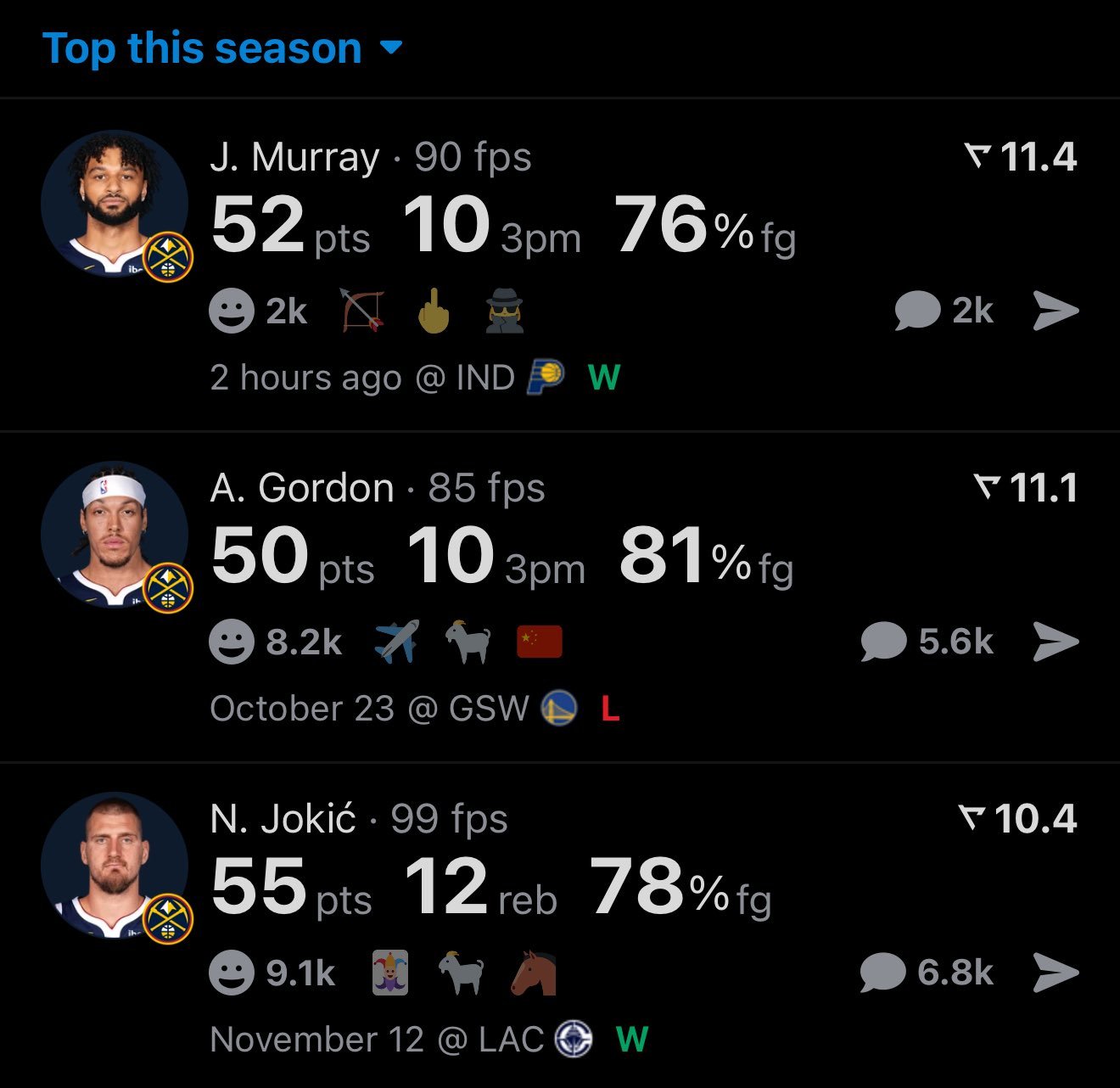 贾马尔-穆雷手感炸裂的一场比赛,25投19中,三分11中10,爆砍赛季新高的52分带队赢球。掘金本赛季已经有三个人砍下50+,此前分别是戈登和约基奇。