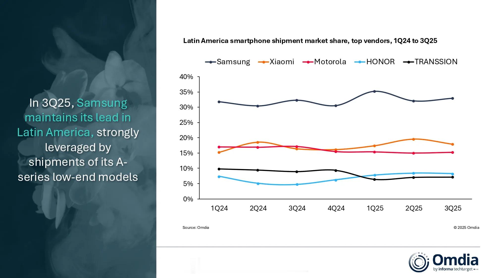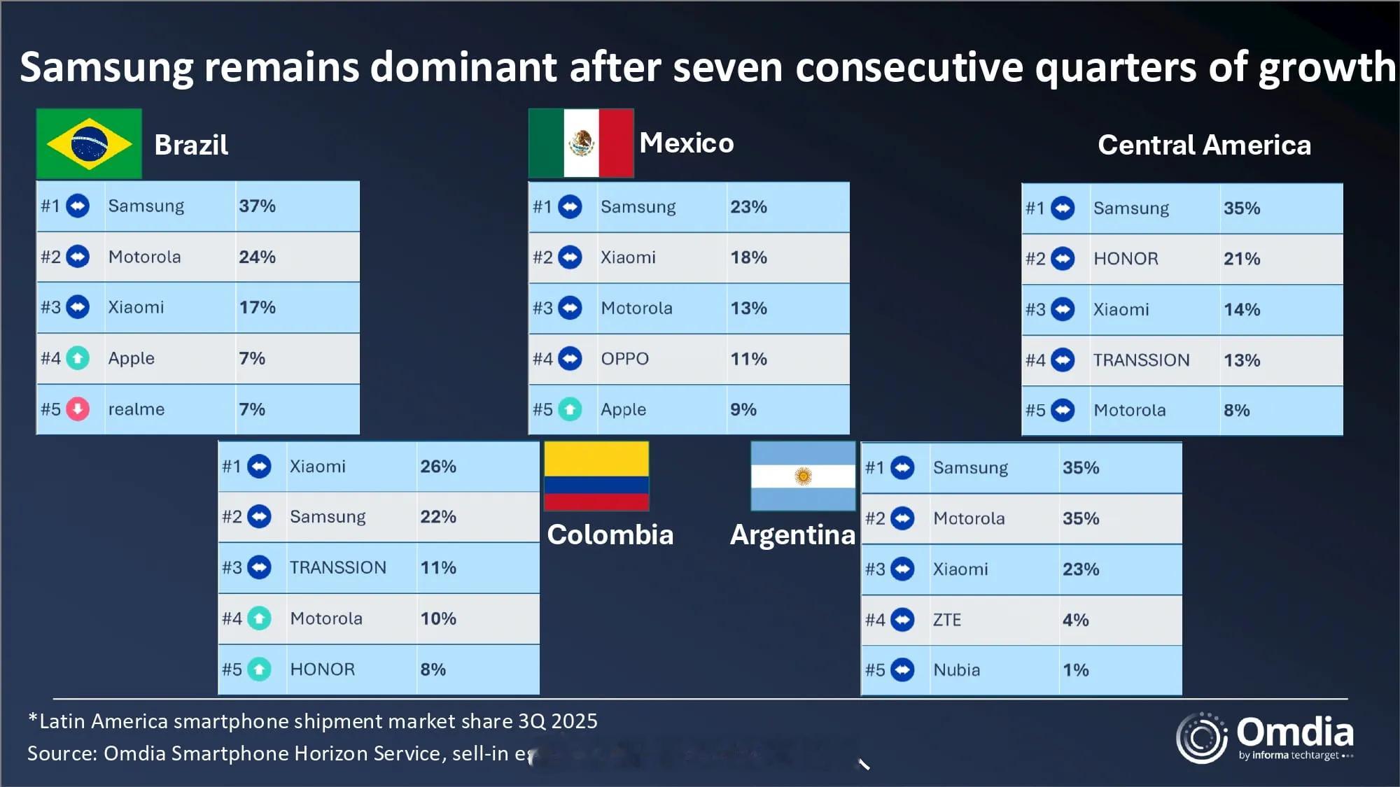 Omdia数据,25Q3拉丁美洲智能机市场同比增长1%,达到3520万部手机。三星33%的份额远高于其他厂商。小米和Moto此消彼长,分别排在第二和第三。荣耀同比增长75%,排在第四。今年荣耀在海外的出货量迅速增长,在拉美,中东非洲,东南亚,欧洲都是高速增长,全年出货国内和海外应该差不多了。手机市场数据分析