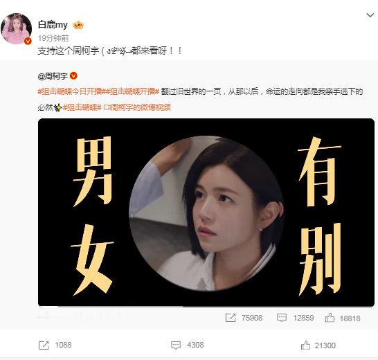 白鹿为周柯宇新剧宣传 白鹿也太讲义气了吧!专门为周柯宇新剧《狙击蝴蝶》宣传,走心又真诚,90% 还原原著的名场面,已经搬好小板凳等开播~白鹿为周柯宇新剧打call