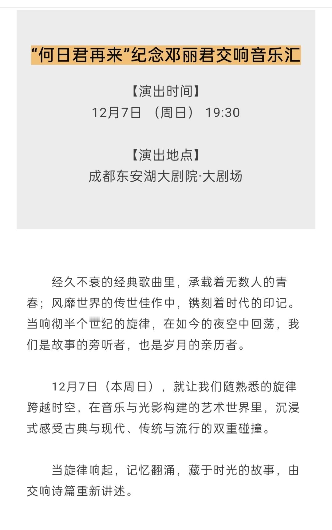 田栩宁官宣纪念邓丽君交响音乐汇田栩宁官宣东安湖音乐季开幕式 “何日君再来”纪念邓丽君交响音乐汇讲述人12月7日在成都东安湖大剧院期待田栩宁!田栩宁成都活动
