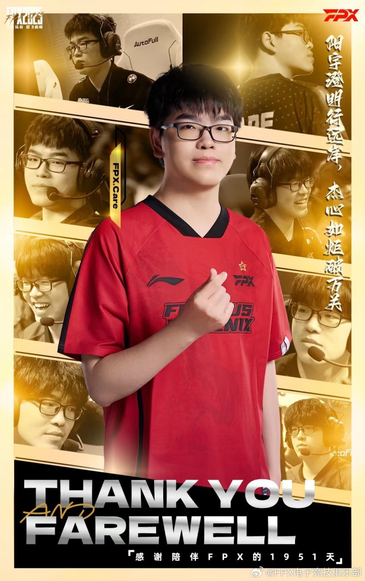 所以当离别悄然而至,心中难免感慨万千。六年的同行,不止于肩上战袍的同色,更是彼此珍视的回忆。感谢阳杰选手陪伴FPX的1951天,也感谢你,让小凤凰的故事更加丰盈与完整。希望你的未来始终春和景明,夏云多奇,秋实盈畴,冬华见朗;也祝愿你在新的队伍里永远心怀热忱,百福具臻,长歌有和,事事舒然。