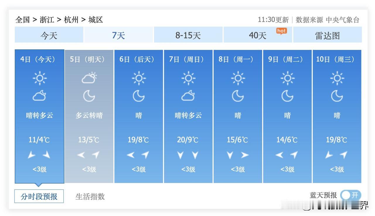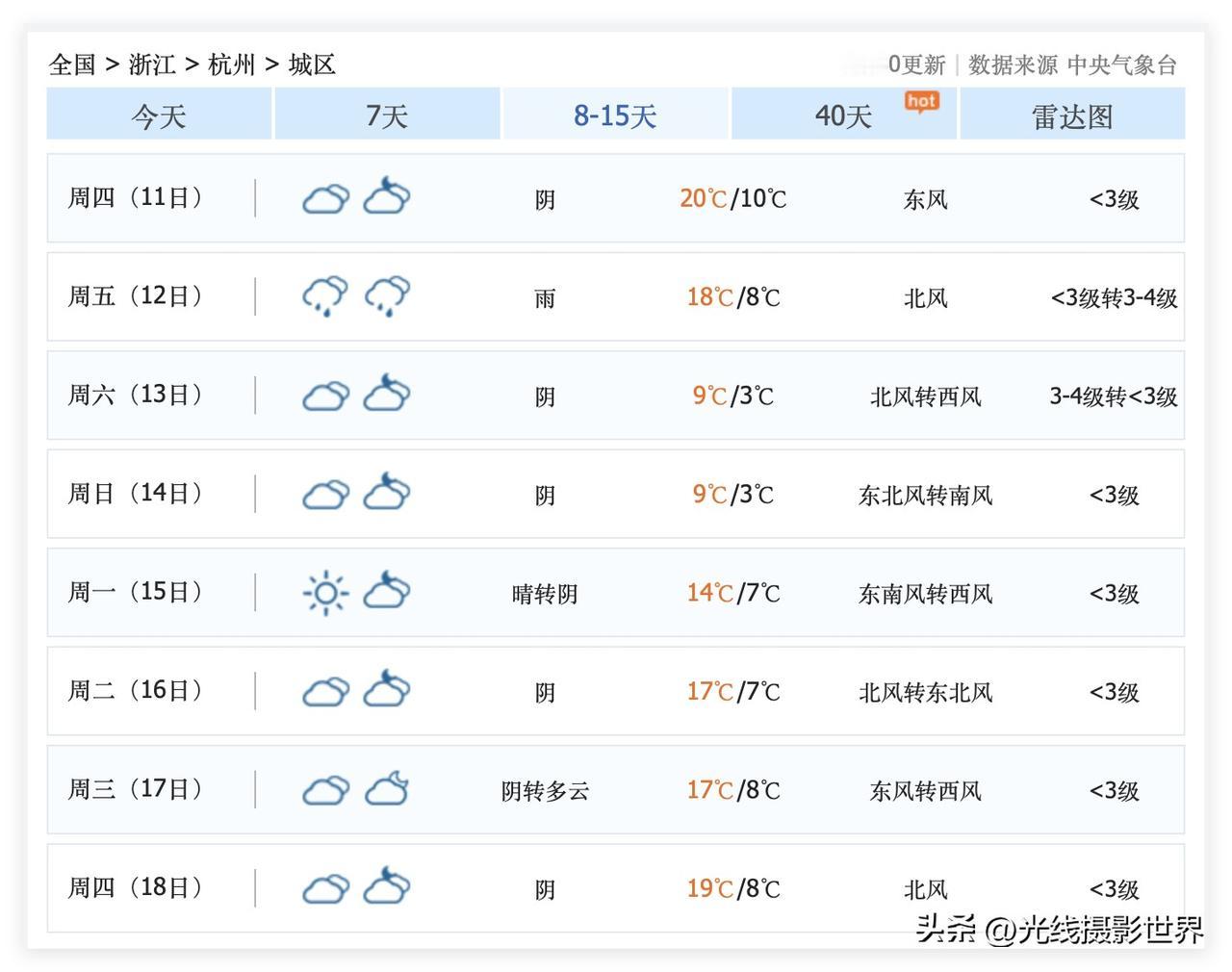 12月11日,星期四,浙江省杭州市的红枫秋色,就要……迎来阴雨连绵的日子,最佳观赏期,正式划上句号啦! 哎!12月1日到4日,连续4天,杭州的天气……一言难尽……几乎不可能拍到大家在网络上刷到的那种杭州红枫的照片…… 12月3日上午的降雨降温和忽然下雨、忽然刮风……已经……对于杭州西湖的很多红枫……这周末,12月6日和7日,大家一定要去曲院风荷和花港观鱼、郭庄……错过,真的哭死,再等一年吧! 12月5日,杭州天气,可能依旧是一言难尽…… 12月6日到10日,杭州天气,应该会比较稳定的好天气……值得期待!