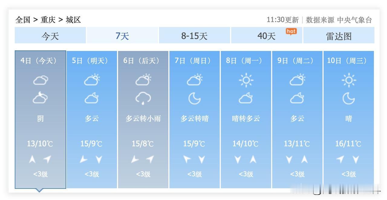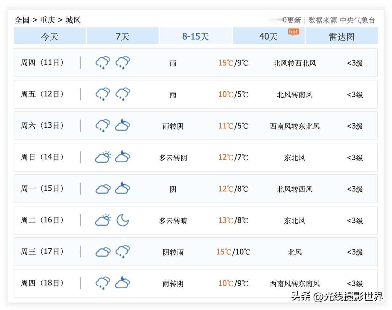 哎!不知道是真的还是假的!12月5日到10日,重庆主城区,经常出太阳!这会是真的吗?!如果是真的,我打算去如下几个地方赏秋:1,吉兴路的五彩斑斓的法国梧桐。2,杨家坪商圈,轻轨2号线列车穿过金黄灿烂的银杏树树顶。3,彩云湖公园,酒醉的多彩的水杉树和落羽杉。 哎!重庆主城区,嘉陵江以北的银杏树,在这周末,应该大多没啥欣赏价值了吧?!轻轨三号线,金渝站--鸳鸯站--重庆园博园站--长福路站,这沿途的银杏树,估计已经基本秃顶了吧?!重庆园博园,中央公园…… 好吧,希望杨家坪商圈的银杏树,一定要坚持住啊!坚持到出太阳啊!