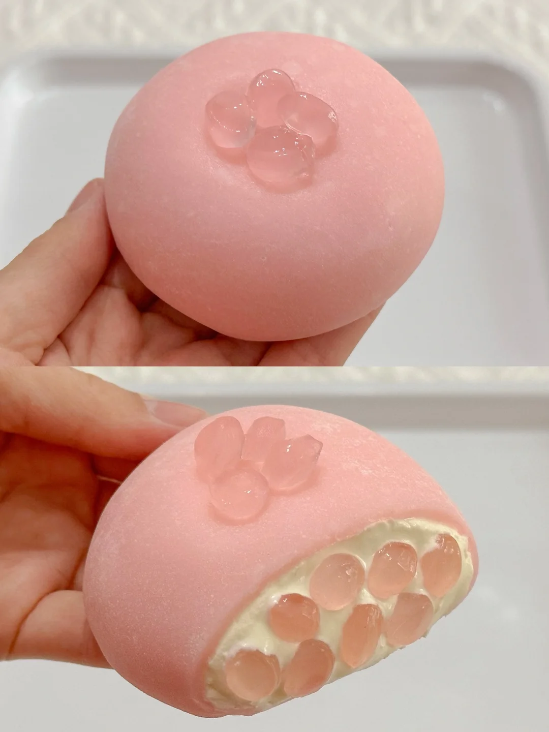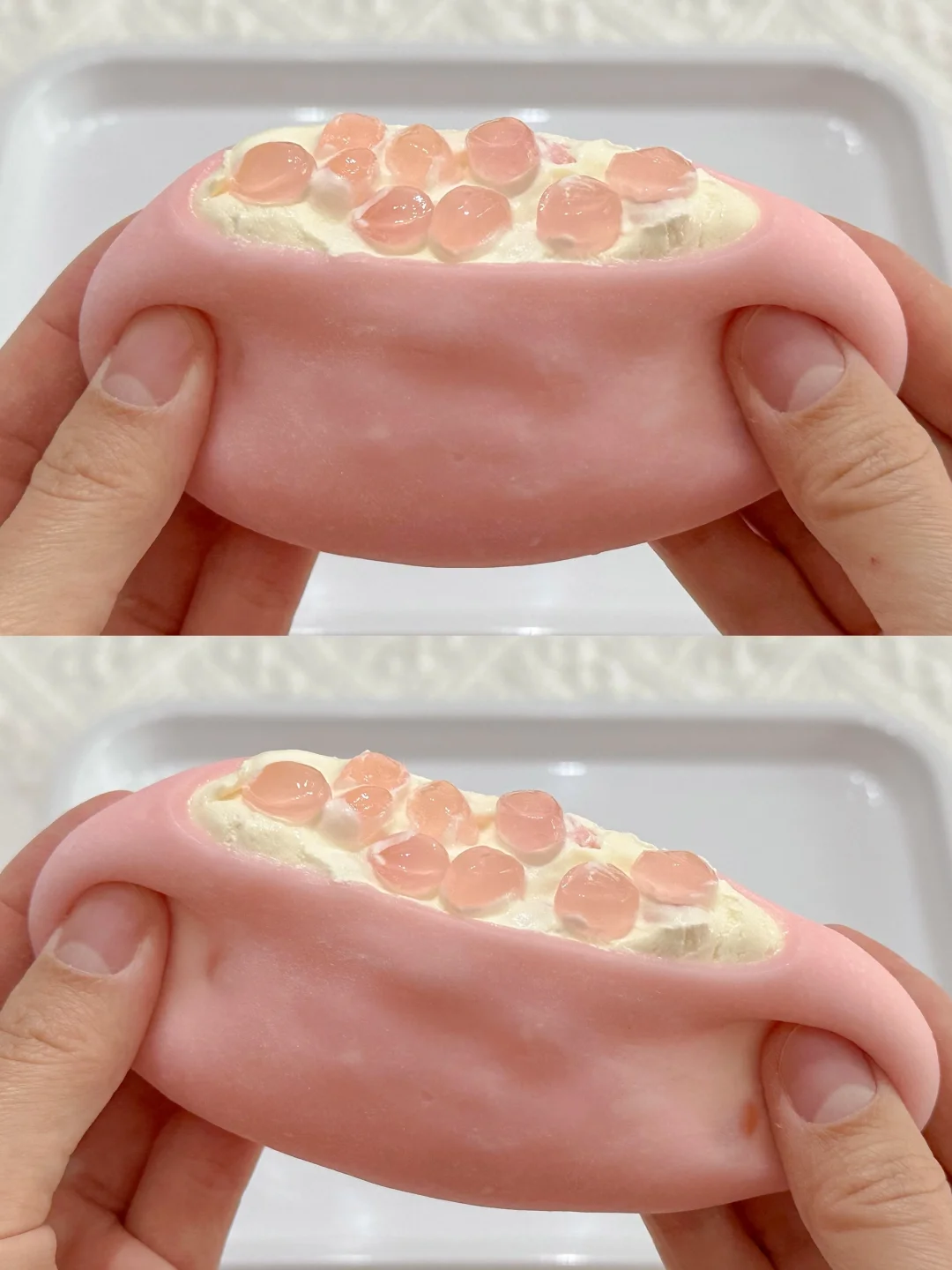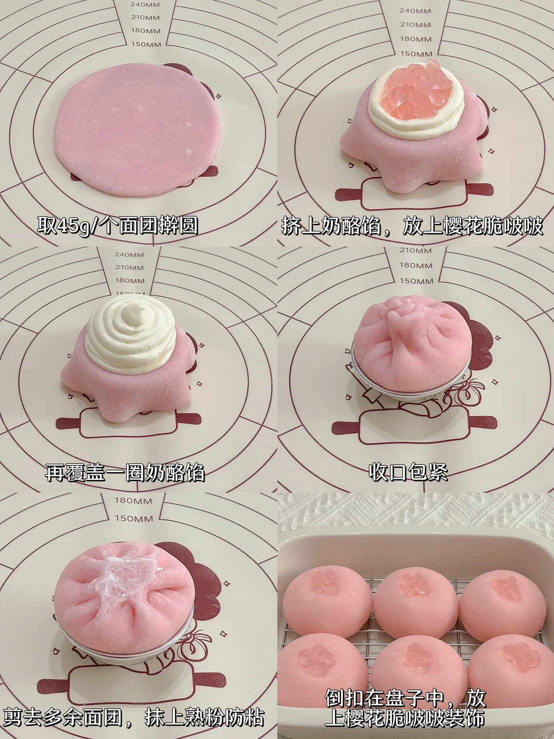 4️⃣取45g/个面团擀圆,挤上一圈奶酪馅,放上樱花脆啵啵,再覆盖一圈奶酪馅,收口包紧,剪去多余面团,抹上熟粉防粘,倒扣在盘子中,放上樱花脆啵啵装饰。