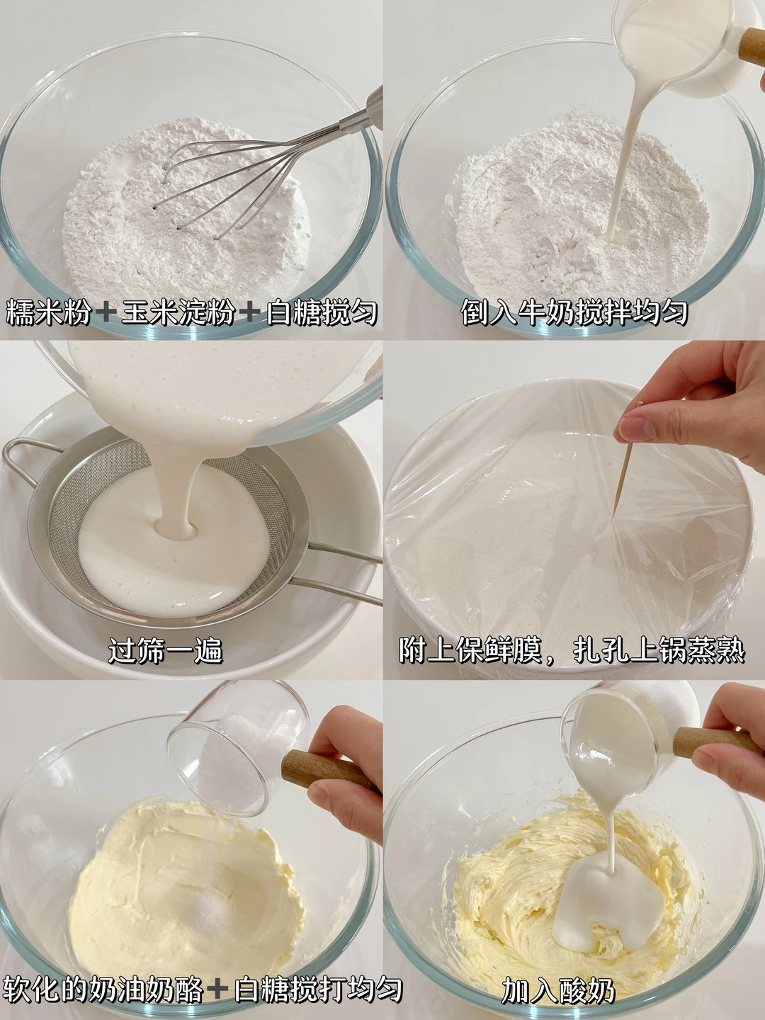 1️⃣糯米粉+玉米淀粉+白糖搅匀,倒入牛奶搅拌均匀,过筛一遍,附上保鲜膜,扎几个孔,上锅蒸25分钟左右。