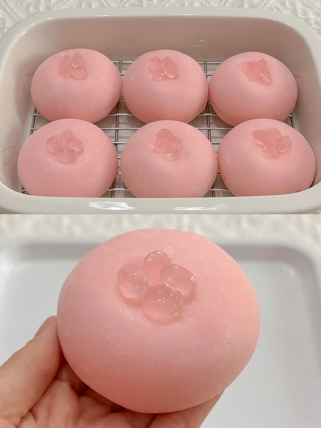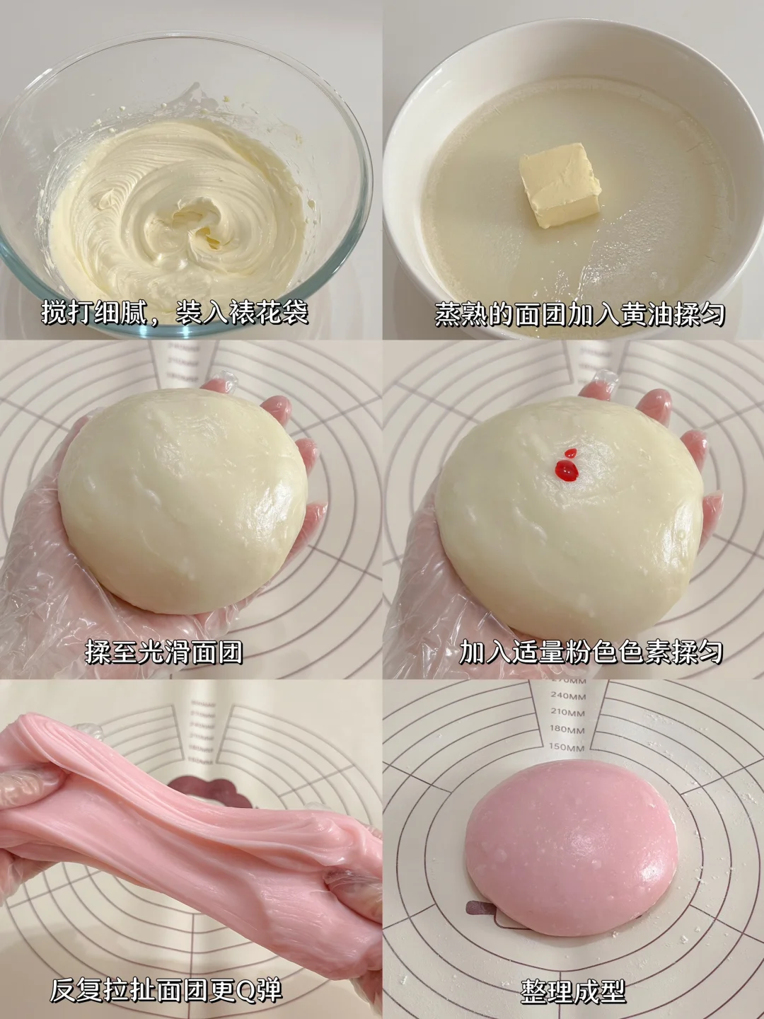 3️⃣蒸熟的面团加入黄油揉匀,揉至光滑面团,加入适量的粉色色素揉匀,反复拉扯面团更Q弹,整理成型。