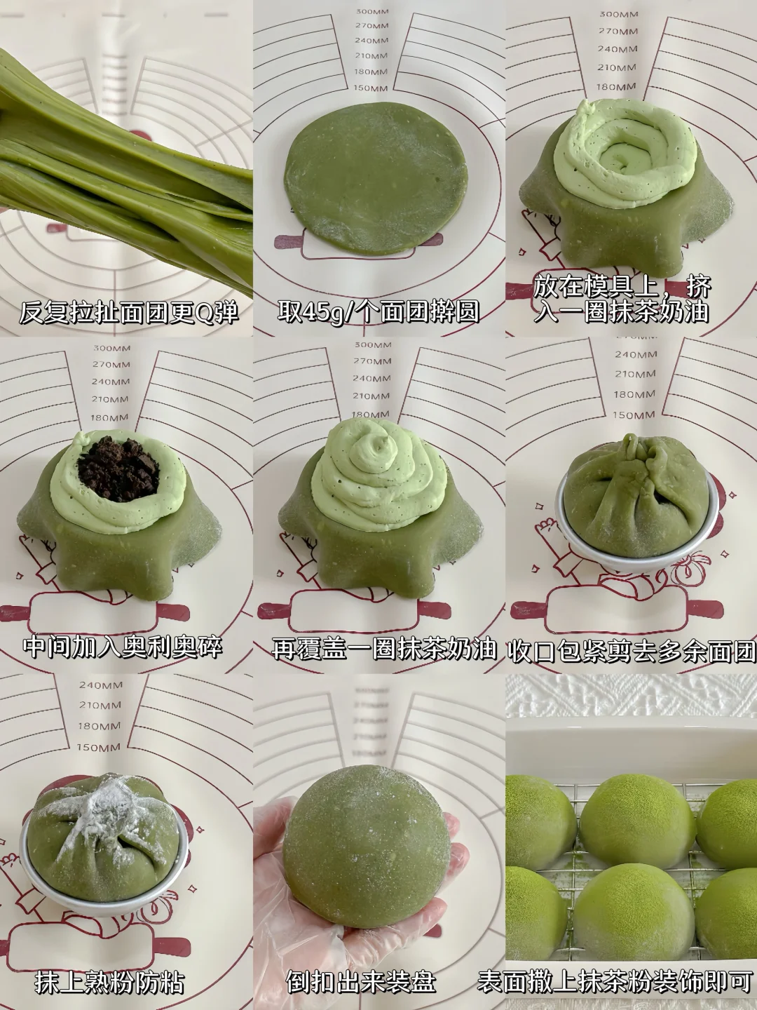 3️⃣蒸熟的面团加入黄油揉匀,反复拉扯面团更Q弹,取45g/个面团擀圆,放在模具上,挤入一圈抹茶奶油,中间加入奥利奥碎,再覆盖一圈抹茶奶油,收口包紧,剪去多余面团,抹上熟粉防粘,倒扣出来装盘,表面撒上抹茶粉即可。