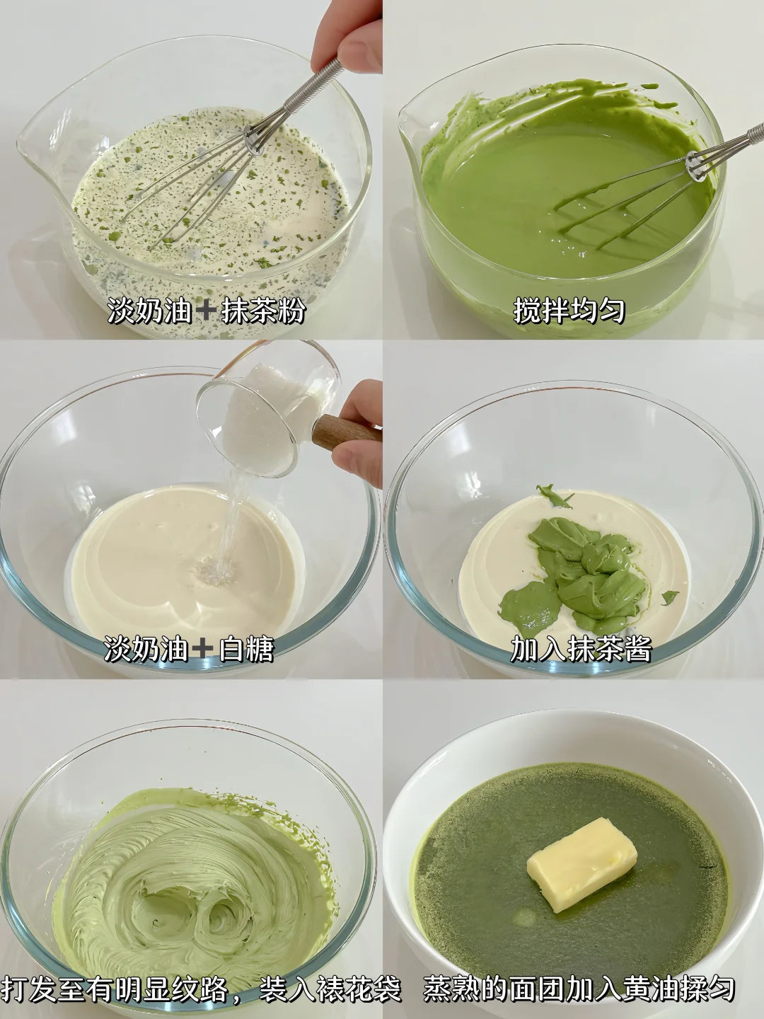 2️⃣淡奶油+抹茶粉搅拌均匀备用;淡奶油+白糖+抹茶酱打发至有明显纹路,装入裱花袋。