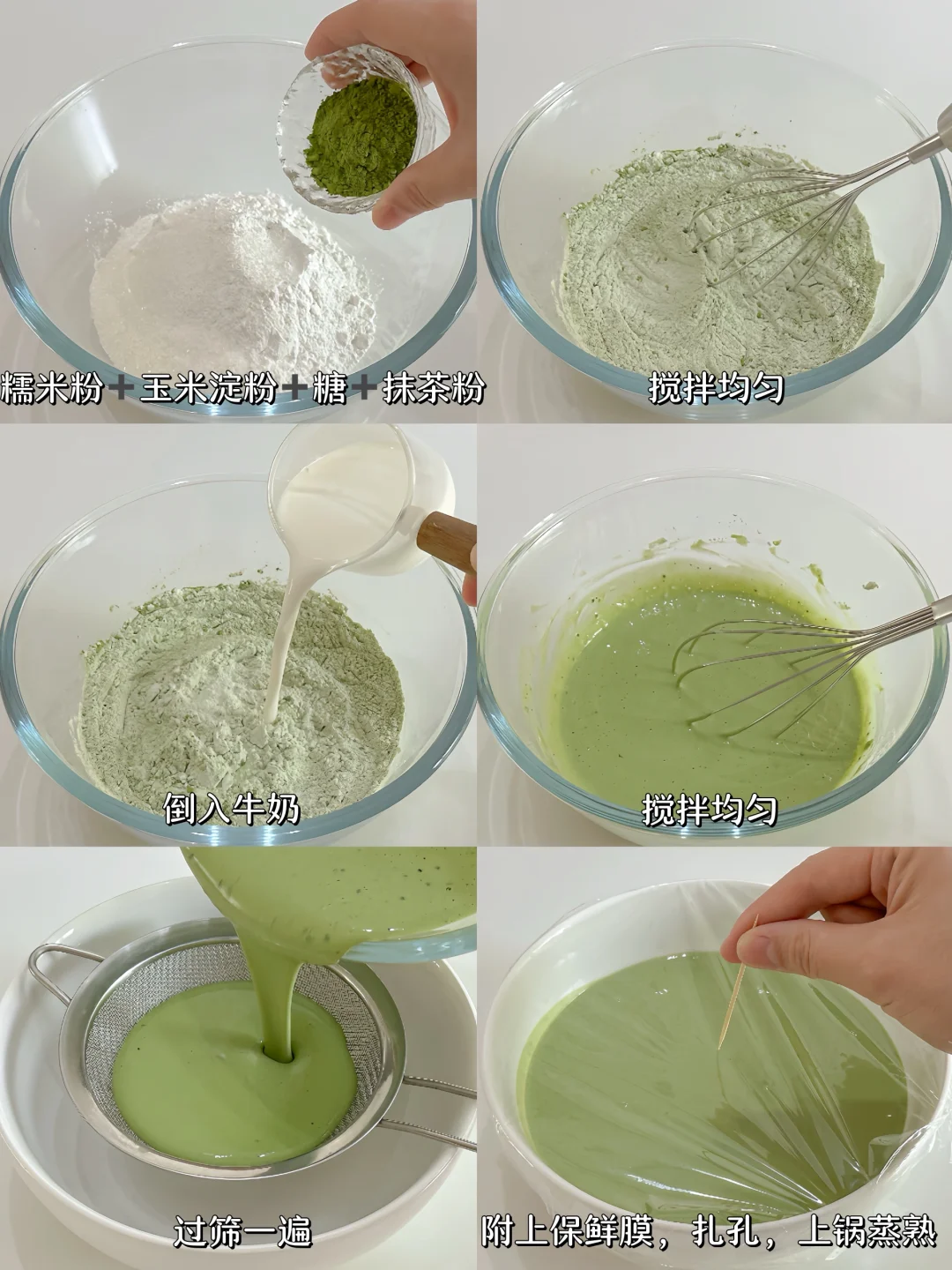 1️⃣糯米粉+玉米淀粉+白糖+抹茶粉混合均匀,倒入牛奶搅拌均匀,过筛一遍,附上保鲜膜,扎孔,上锅蒸20分钟左右。