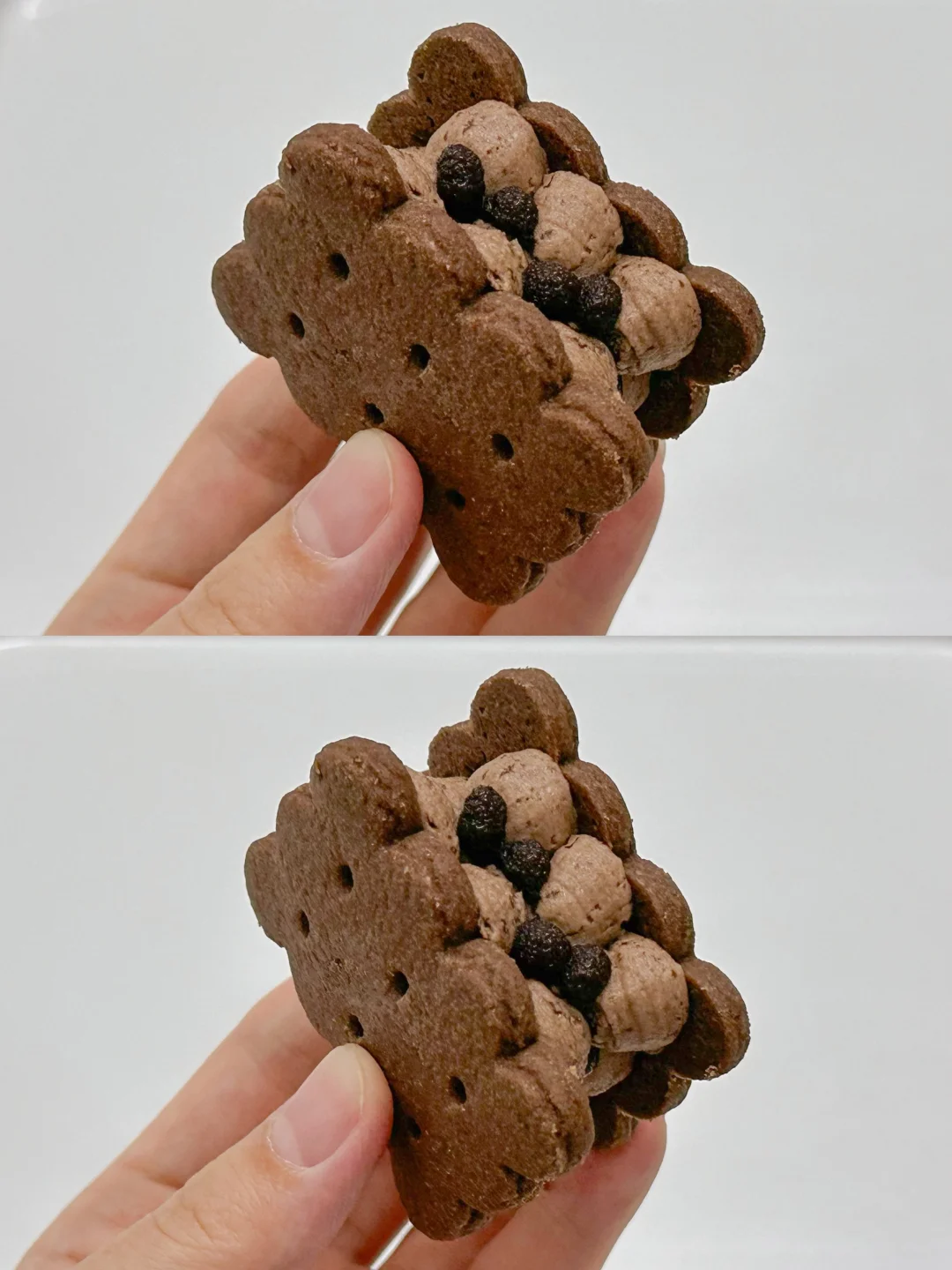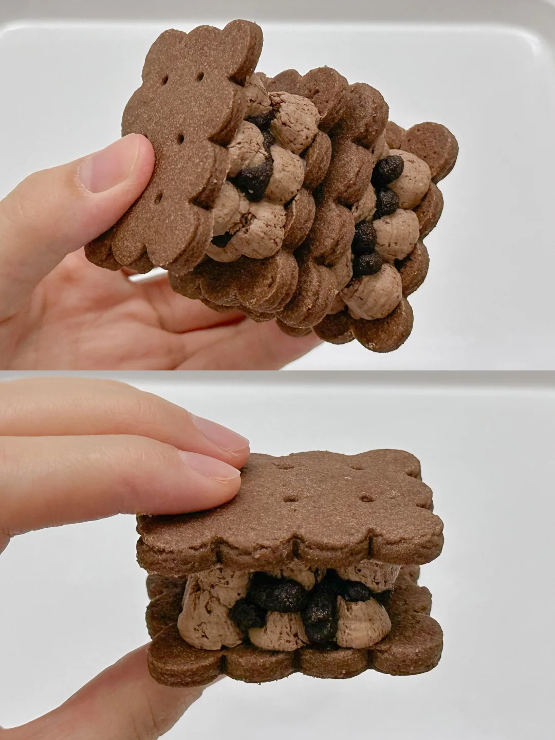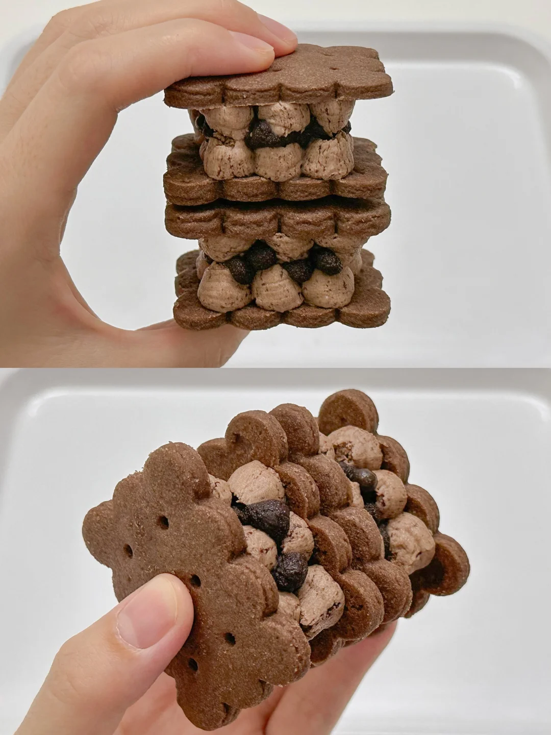 5️⃣饼干烤好后放凉,饼干背面朝上,挤入黑巧乳酪馅,再挤入甘纳许,放上巧克力脆珠珠,再将两块饼干合二为一即可。