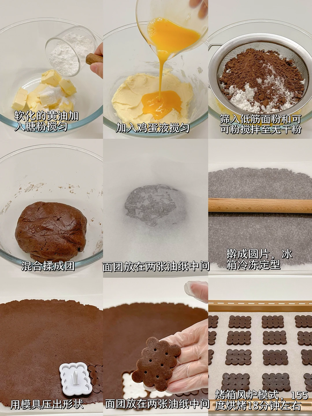 1️⃣软化的黄油加入糖粉搅匀,加入鸡蛋液搅匀,筛入低筋面粉和可可粉搅拌至无干粉并混合揉成团。