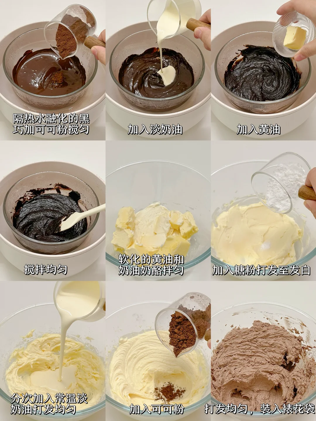 4️⃣软化的黄油和奶油奶酪拌匀,加入糖粉打发至发白。分次加入常温淡奶油打发均匀,再加入可可粉打发均匀,装入裱花袋备用。