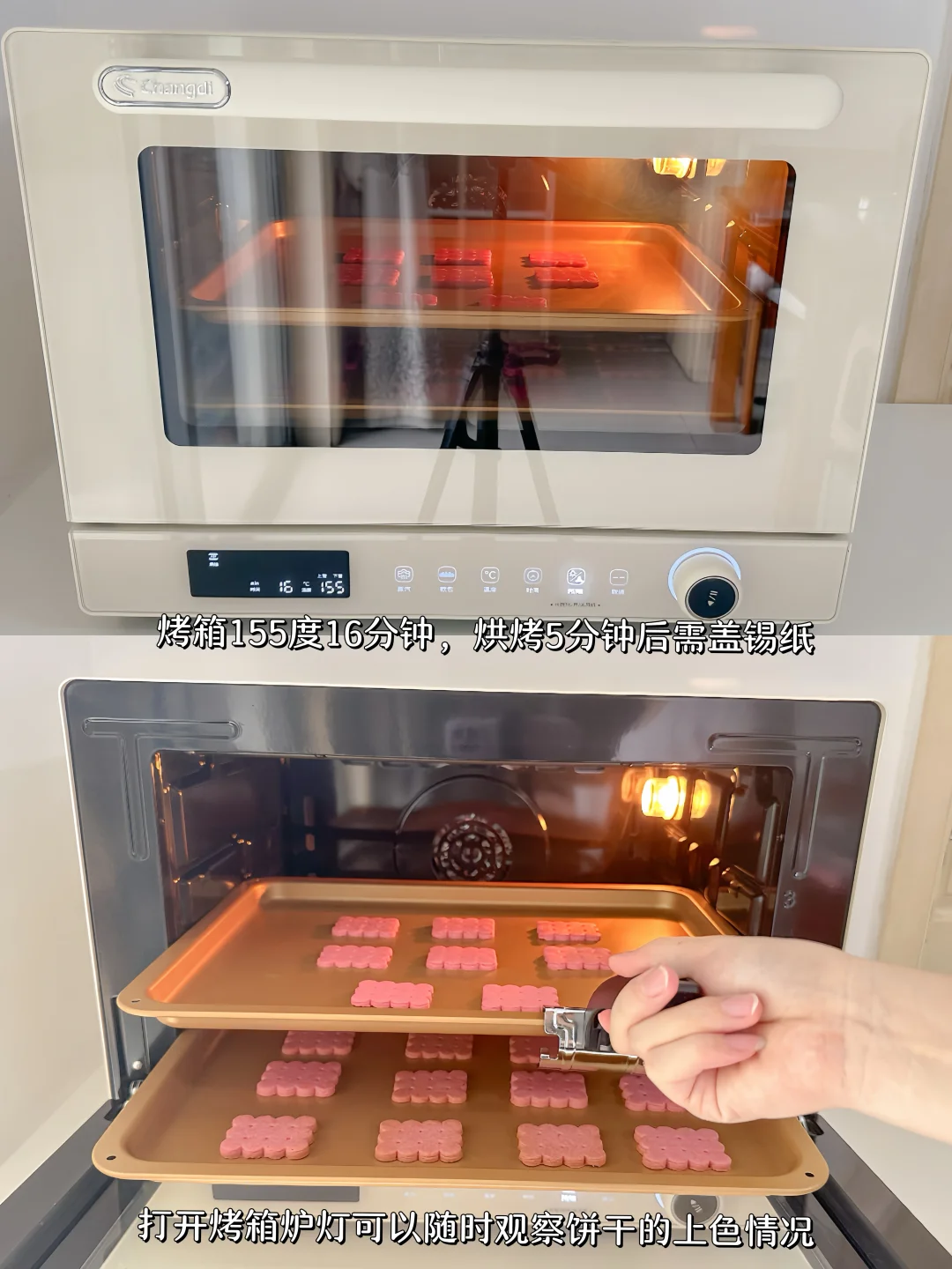 2️⃣将面团放在两张油纸中间擀成大圆片,放入冰箱冷冻,冷冻好用模具压出形状,放在烤盘上,烤箱提前预热,烤箱155度16分钟,烘烤5分钟后盖锡纸继续烘烤,烤好放凉备用。