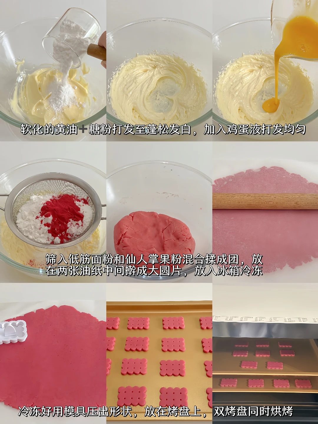 1️⃣软化的黄油+糖粉打发至蓬松发白,加入鸡蛋液打发均匀,筛入低筋面粉和仙人掌果粉混合揉成团。