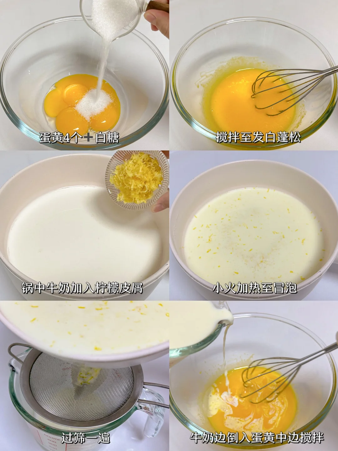1⃣️蛋黄4个+白糖搅拌至发白蓬松,锅中牛奶加入柠檬皮屑小火加热至冒泡,过筛一遍,牛奶边倒入蛋黄中边快速搅拌,少量多次倒入搅拌均匀。