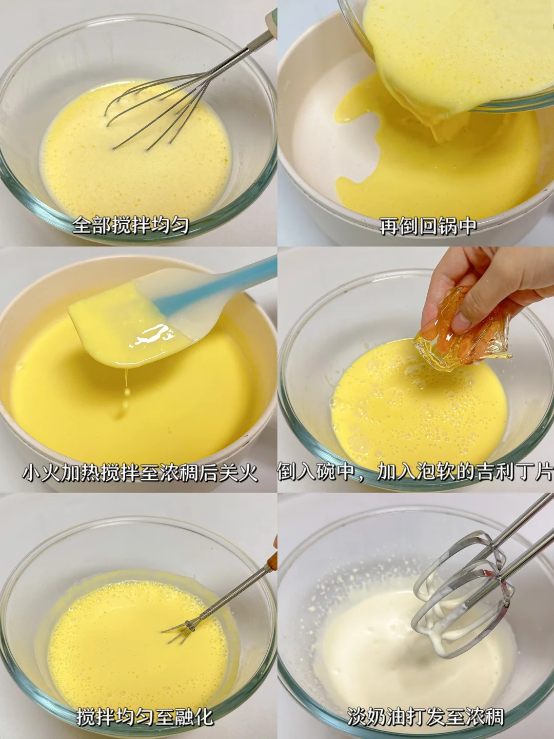 2⃣️将蛋黄糊再倒回锅中小火加热搅拌至浓稠后关火,倒入碗中,加入泡软的吉利丁片搅拌至融化,淡奶油打发至浓稠,将稍放凉的蛋黄糊倒入淡奶油中搅拌均匀。