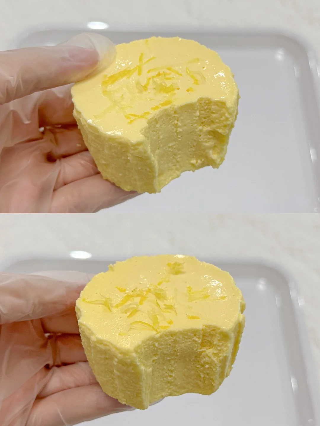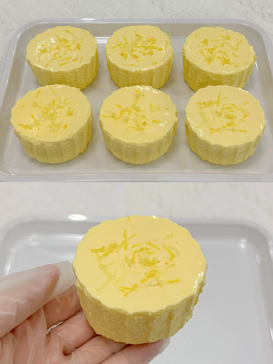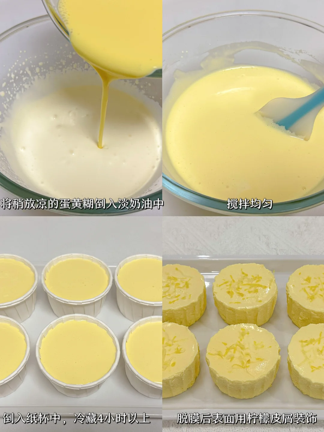 3⃣️倒入纸杯中,冷藏4小时以上后脱模,表面用柠檬皮屑装饰即可。