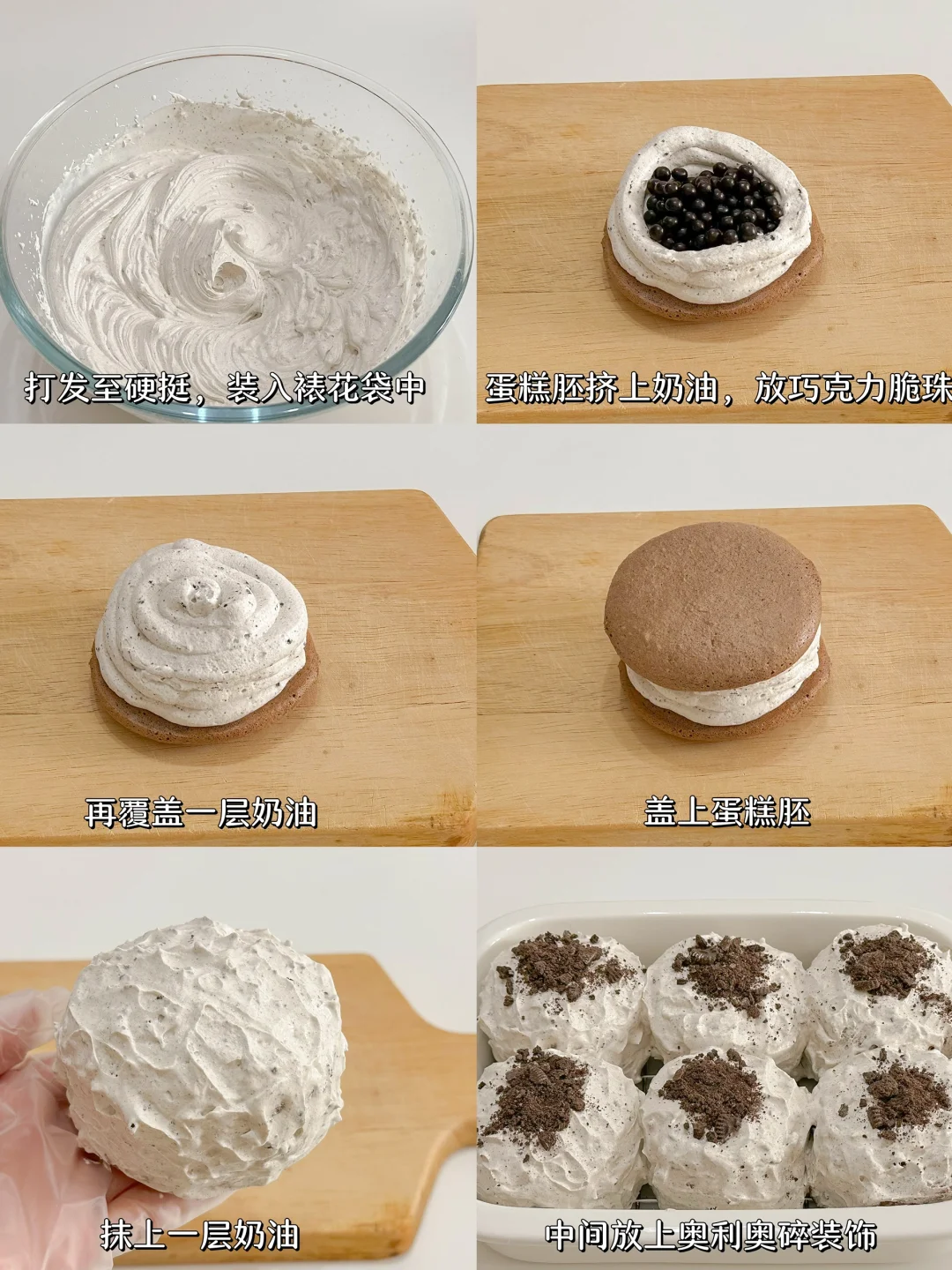 4️⃣蛋糕胚挤上奶油,放上巧克力脆珠,再覆盖一层奶油,盖上蛋糕胚,表面抹上一层奶油,中间放上奥利奥碎装饰即可。