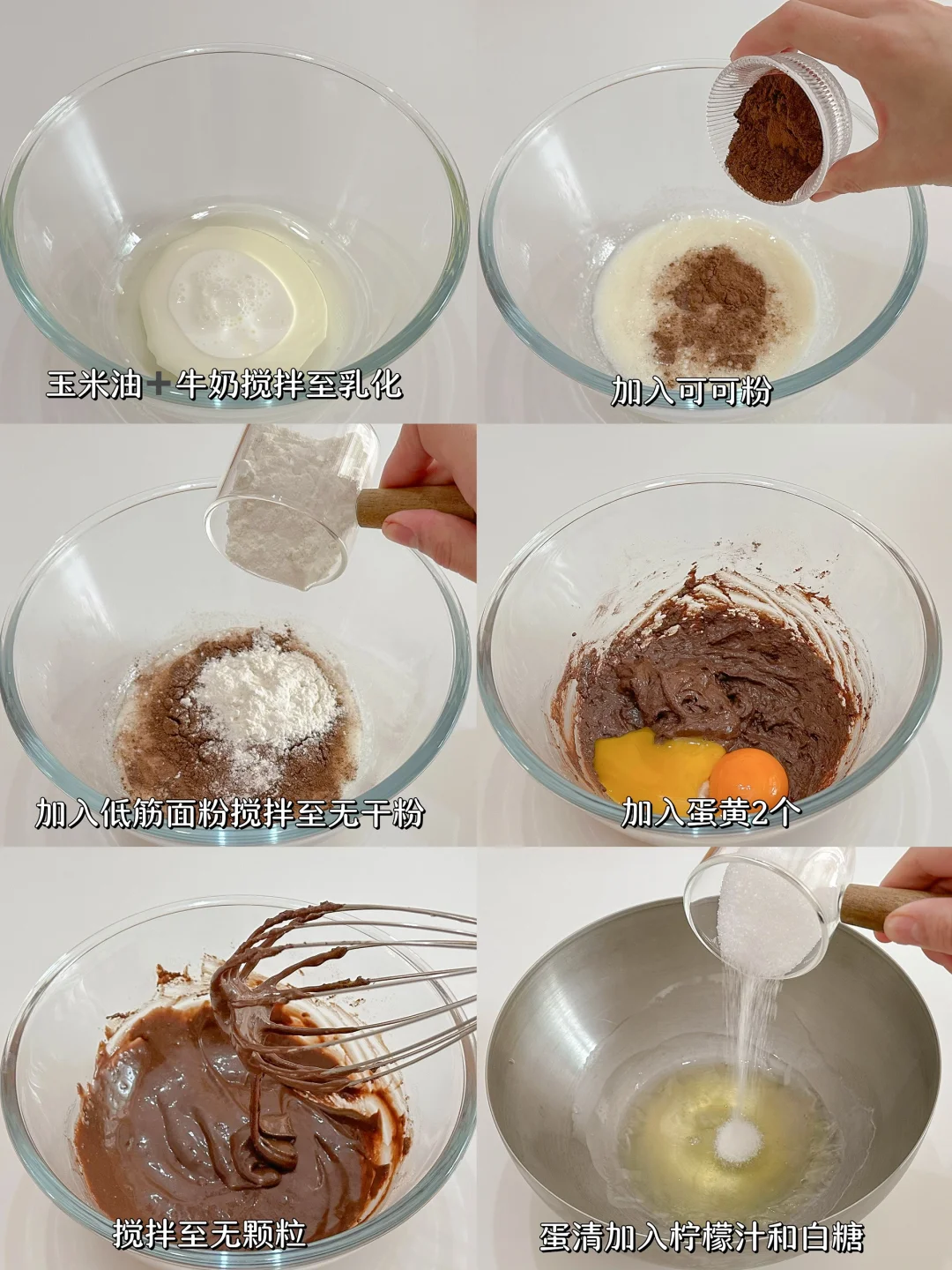 1️⃣玉米油加牛奶搅拌至乳化,加入可可粉和低筋面粉搅拌至无干粉,加入蛋黄2个搅拌至无颗粒。
