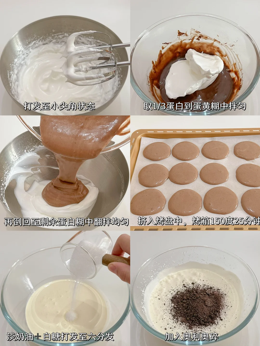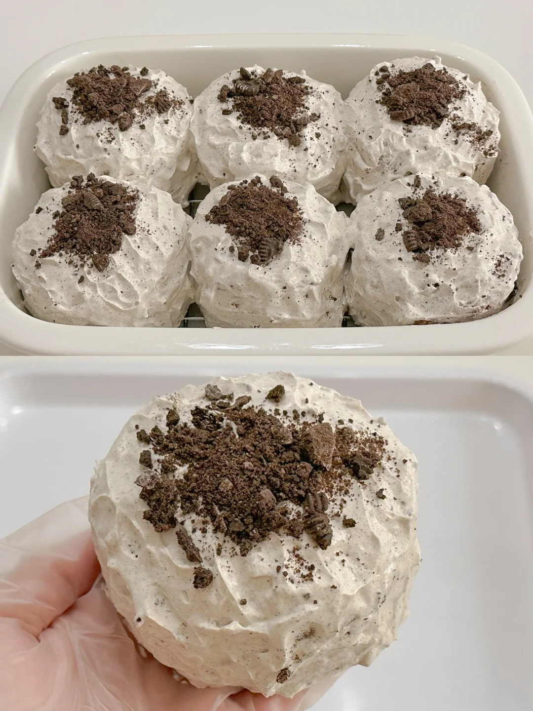 3️⃣淡奶油加白糖打发至六分发,加入奥利奥碎打发至硬挺备用。