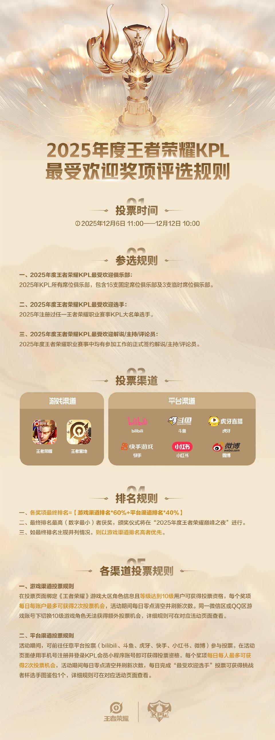 2025年度王者荣耀KPL最受欢迎奖项评选活动将于12月6日11:00正式开启!