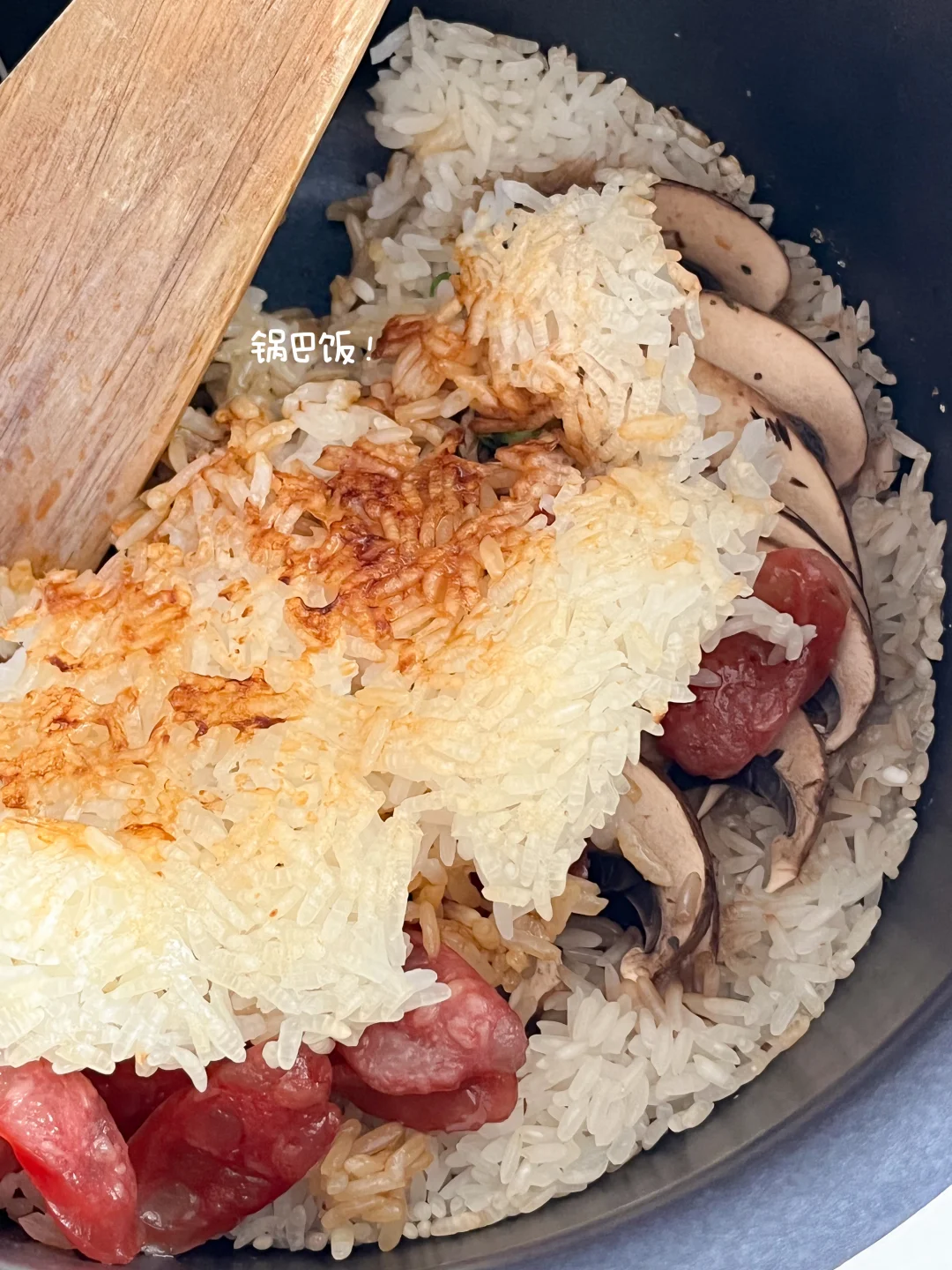 脆锅巴+米饭+牛排菇 腊肠 淋上淡口酱油