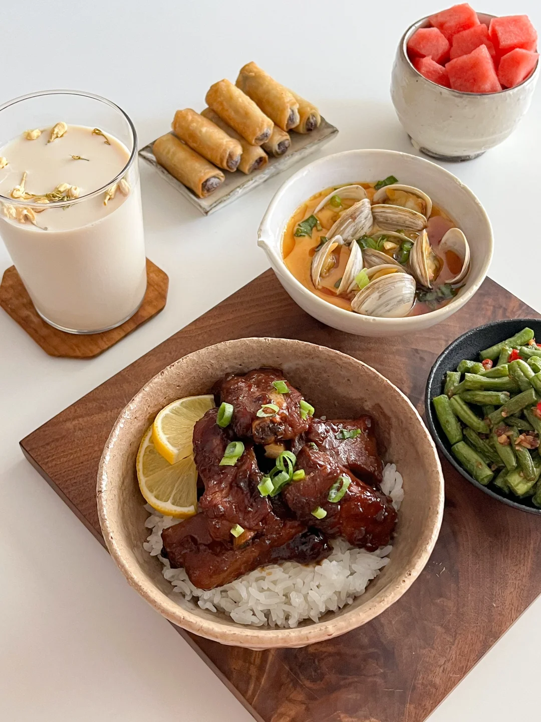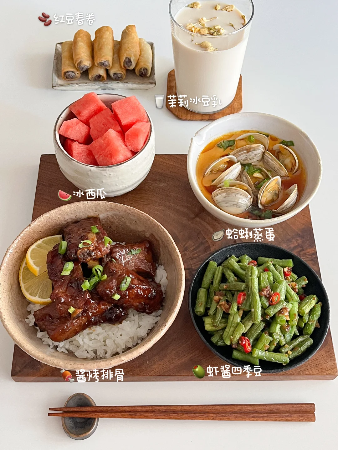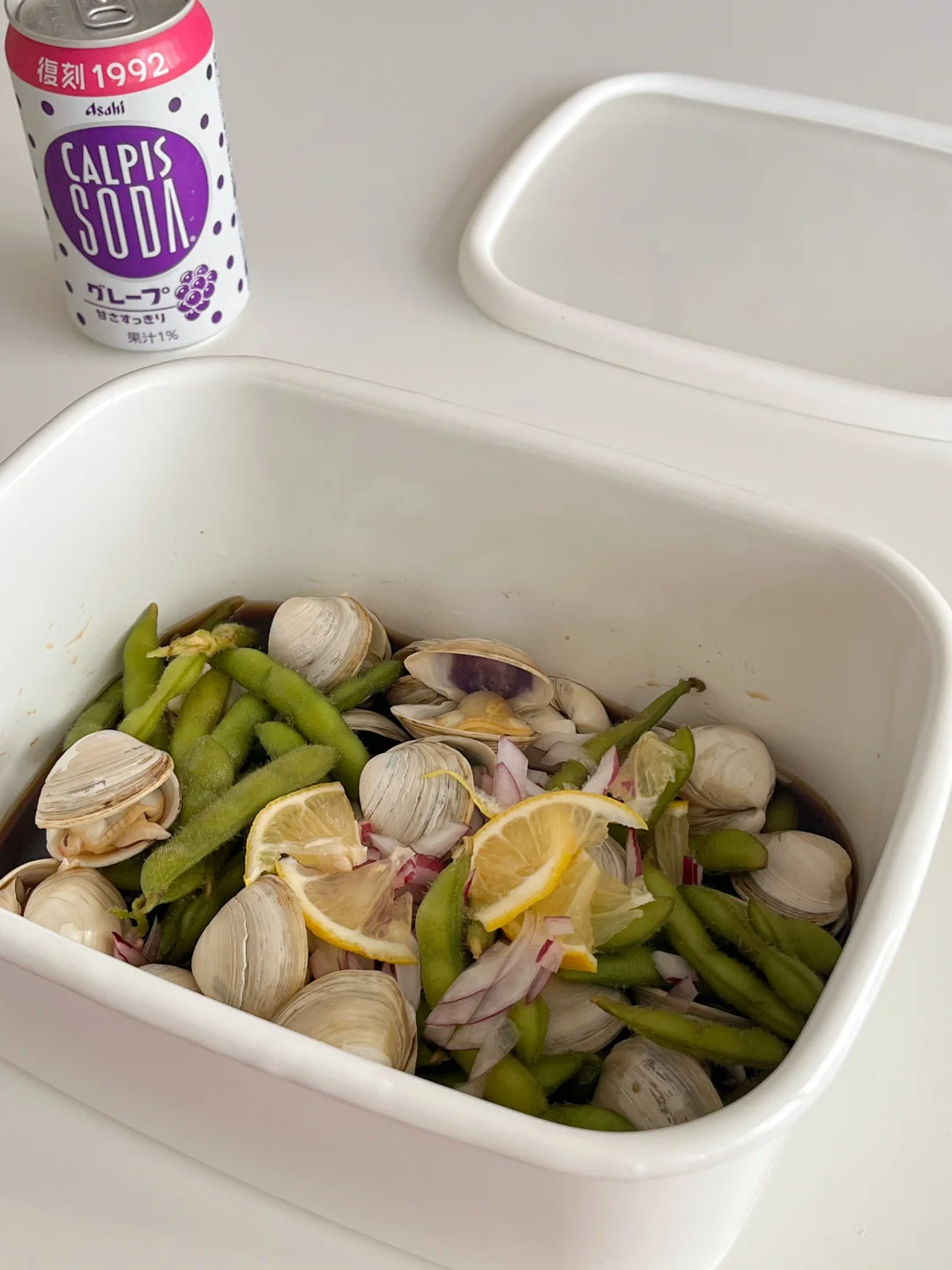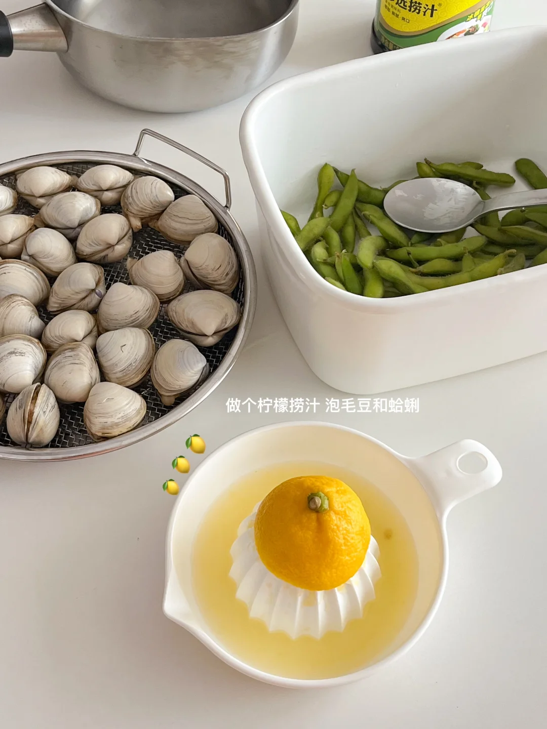 夏天一来 万物皆可捞汁 买了一斤多的蛤蜊 挑几个蒸蛋 剩下的和毛豆一起做柠檬捞汁吃 捞汁🫗+雪碧🫧+冰块🧊+柠檬🍋 冰镇一下午 到晚上吃口感更丰富了 今天的饭: 酱烤排骨🍖 虾酱四季豆🫒 蛤蜊蒸蛋🦪 茉莉冰豆乳🥛 冰西瓜🍉