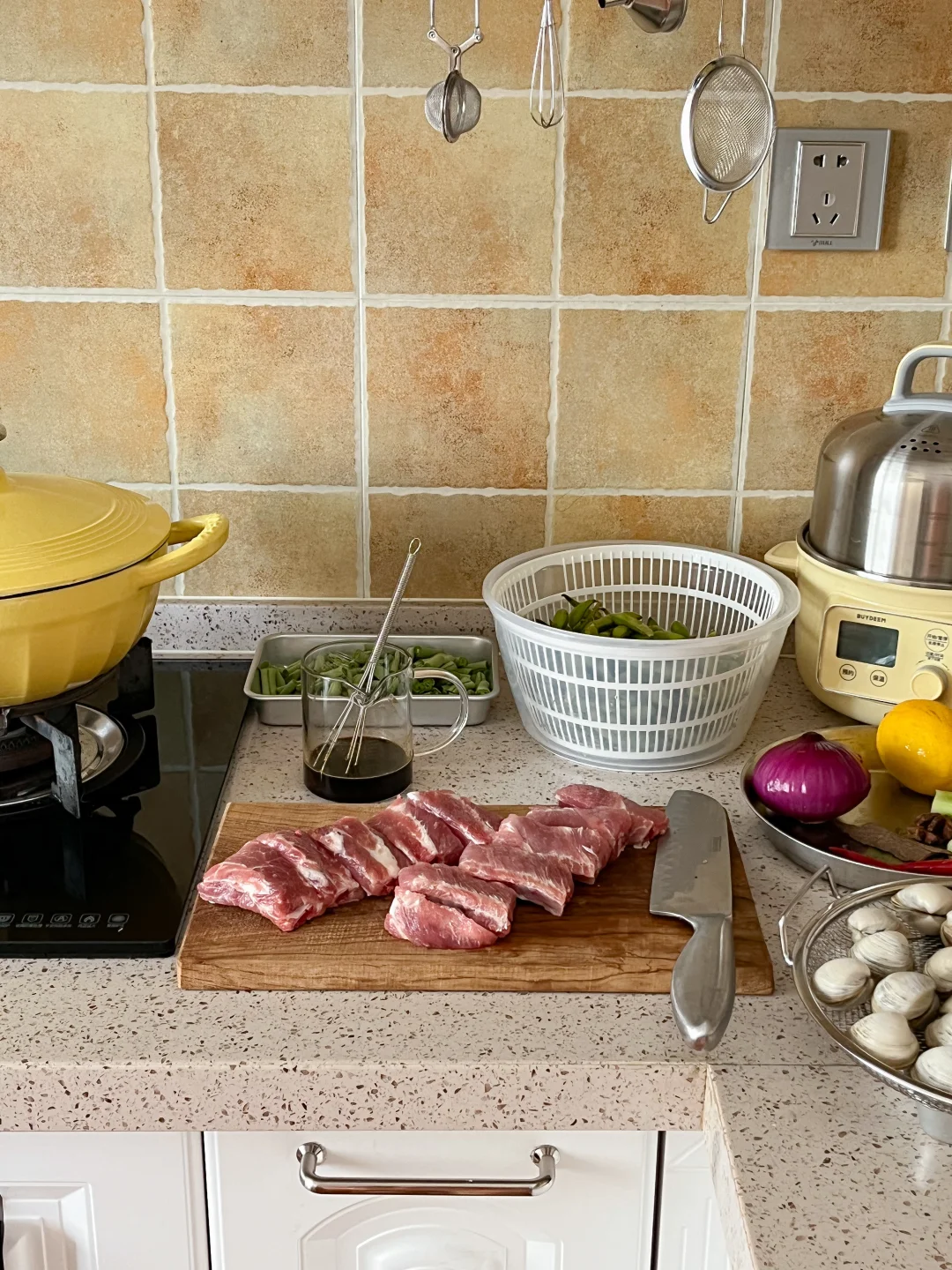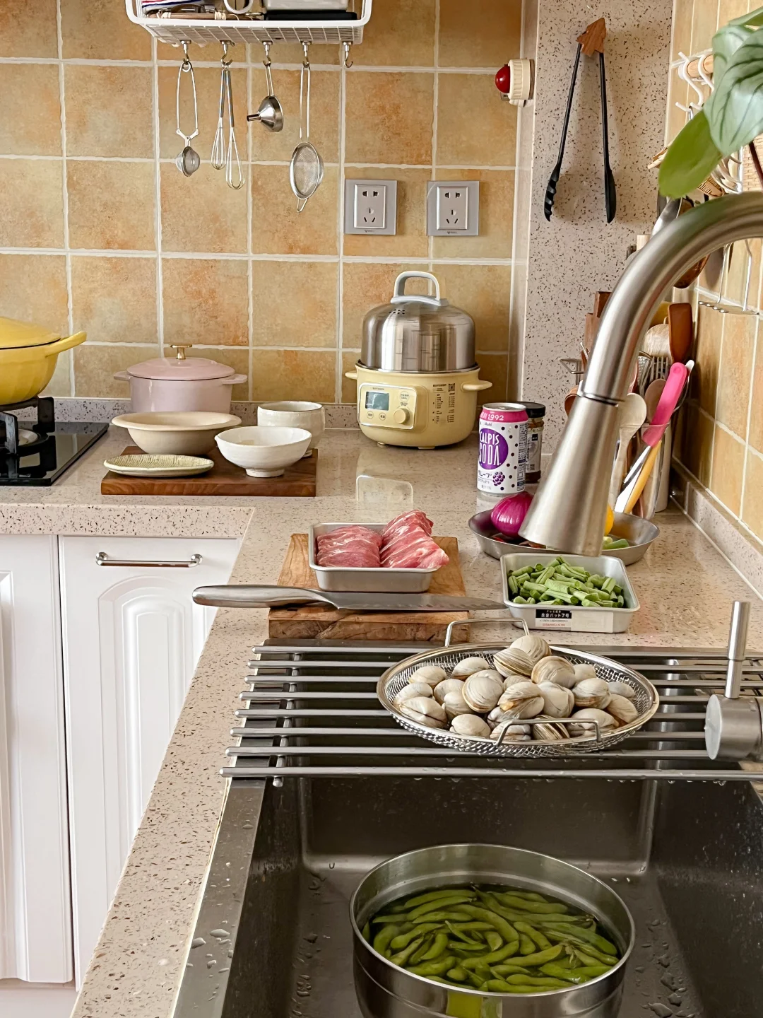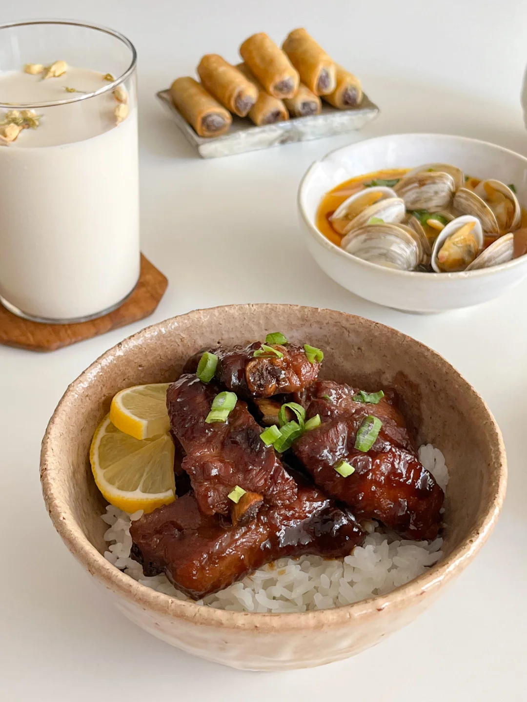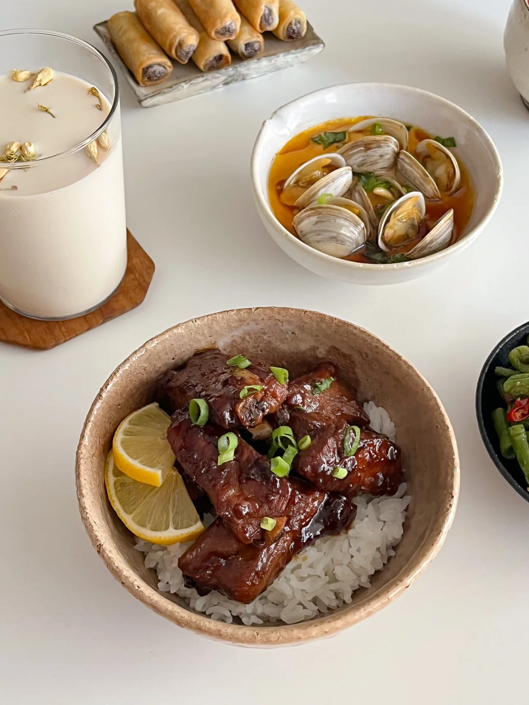 夏天一来 万物皆可捞汁 买了一斤多的蛤蜊 挑几个蒸蛋 剩下的和毛豆一起做柠檬捞汁吃 捞汁🫗+雪碧🫧+冰块🧊+柠檬🍋 冰镇一下午 到晚上吃口感更丰富了 今天的饭: 酱烤排骨🍖 虾酱四季豆🫒 蛤蜊蒸蛋🦪 茉莉冰豆乳🥛 冰西瓜🍉