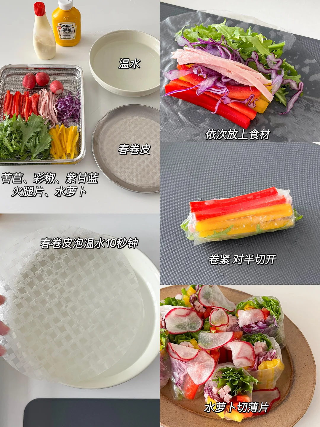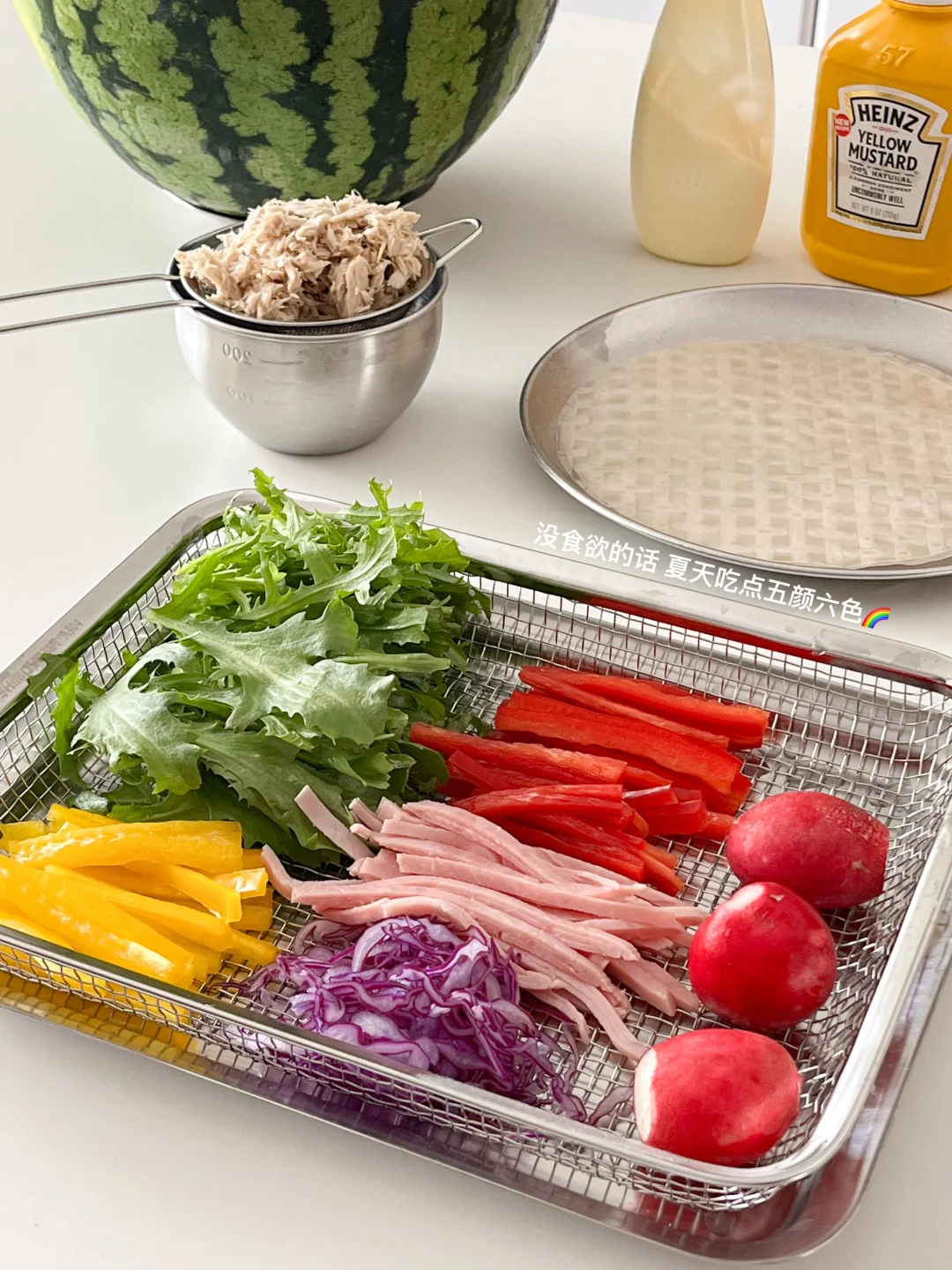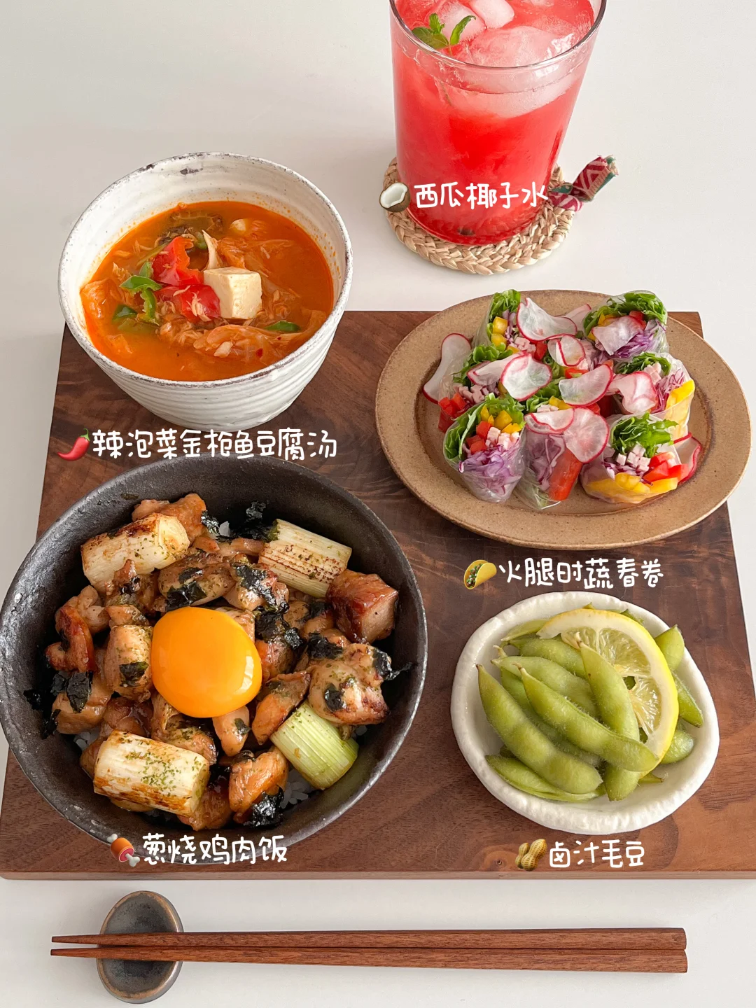 今年夏天好像下火了一样 怎么这么热 还是在家吃点冰镇西瓜和卤汁毛豆降降温吧 有点没食欲 做了点酸酸辣辣的泡菜汤 五颜六色的蔬菜春卷 QQ的口感 不爱吃的蔬菜包起来 统统吃掉[暗中观察R] 有芒果的话放一个 味道丰富更好吃 用沙拉酱和泰式酸甜酱1:1 调的酱料 冰镇西瓜🍉+满冰🧊+椰子水🥥 这个搭配很好喝!清爽还解暑 今天的饭: 葱烧鸡肉饭🍖 火腿时蔬春卷🌮 辣泡菜金枪鱼豆腐汤🌶 卤汁毛豆🥜 西瓜冰椰子水🥥