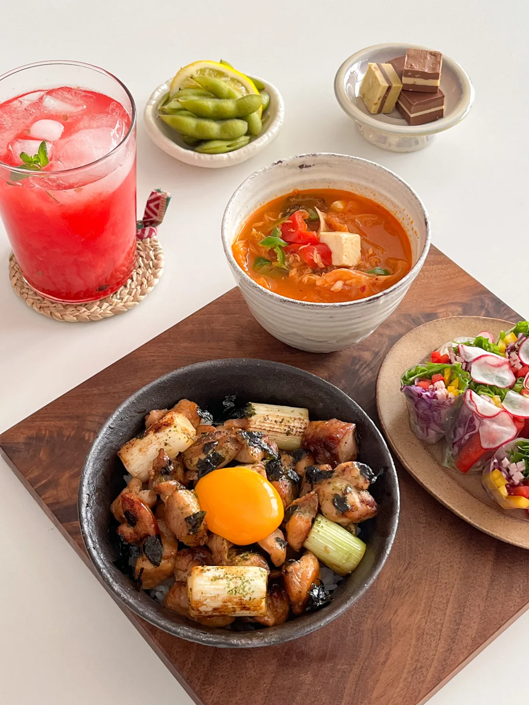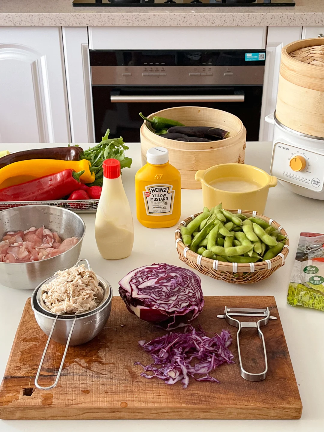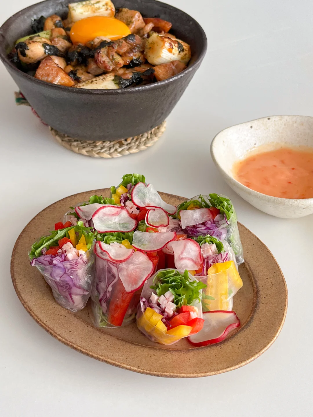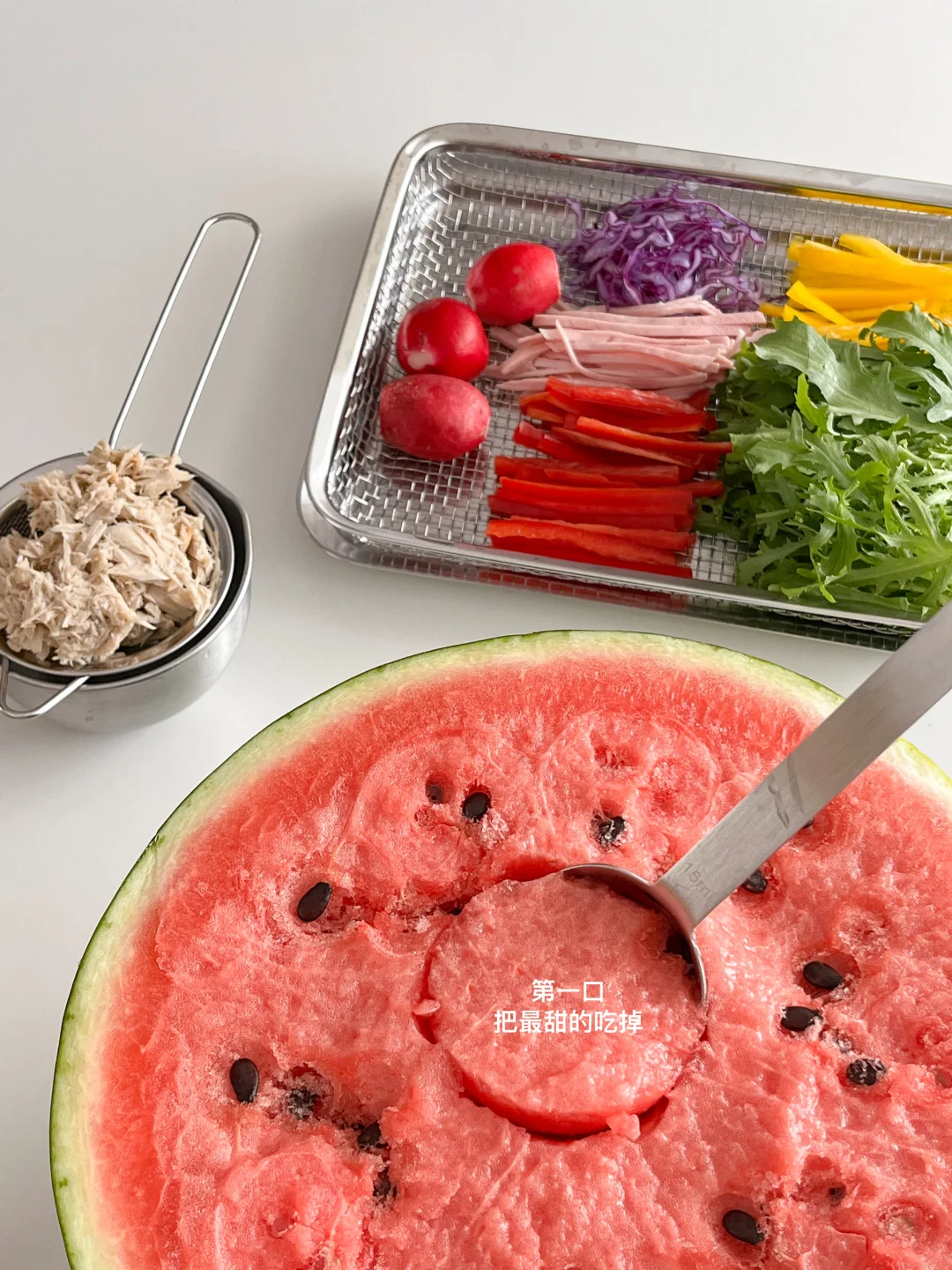 今年夏天好像下火了一样 怎么这么热 还是在家吃点冰镇西瓜和卤汁毛豆降降温吧 有点没食欲 做了点酸酸辣辣的泡菜汤 五颜六色的蔬菜春卷 QQ的口感 不爱吃的蔬菜包起来 统统吃掉[暗中观察R] 有芒果的话放一个 味道丰富更好吃 用沙拉酱和泰式酸甜酱1:1 调的酱料 冰镇西瓜🍉+满冰🧊+椰子水🥥 这个搭配很好喝!清爽还解暑 今天的饭: 葱烧鸡肉饭🍖 火腿时蔬春卷🌮 辣泡菜金枪鱼豆腐汤🌶 卤汁毛豆🥜 西瓜冰椰子水🥥