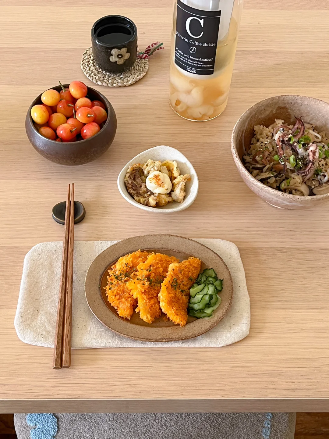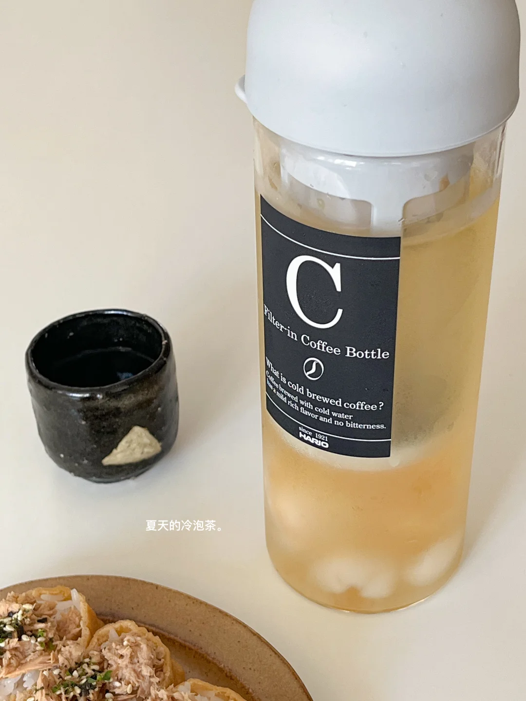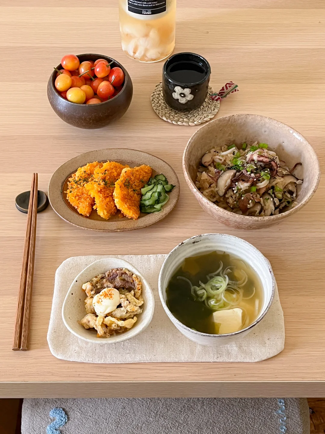 找到了消耗家里茶叶的好办法 就是做各式各样的冷泡茶🍵 现在是荔枝季 刚好是我最喜欢的 冷泡完的绿茶有淡淡的果香 不涩口 今天的饭: 麻油鸡肉鱿鱼饭🐙 炸土豆泥沙拉火腿片🍘 豆腐裙带菜味增汤🍥 冷泡荔枝绿茶🍵