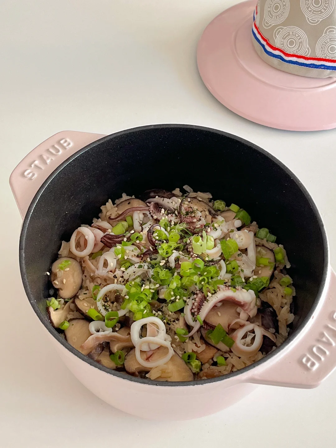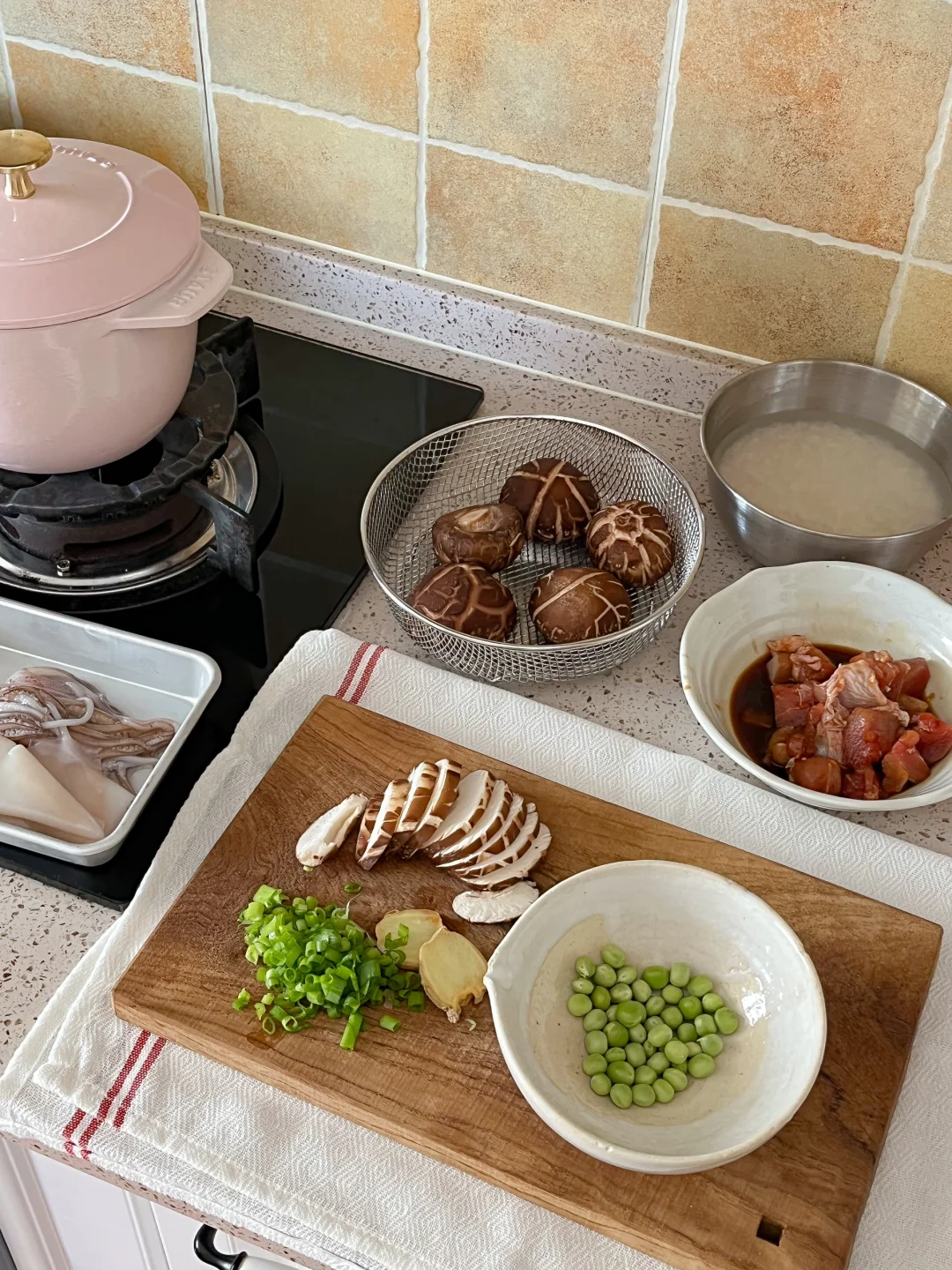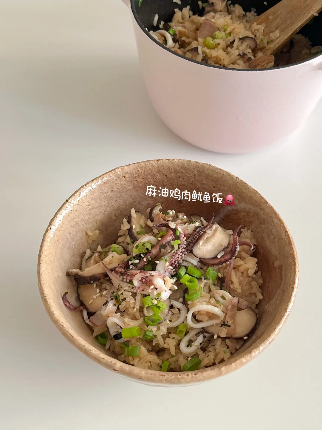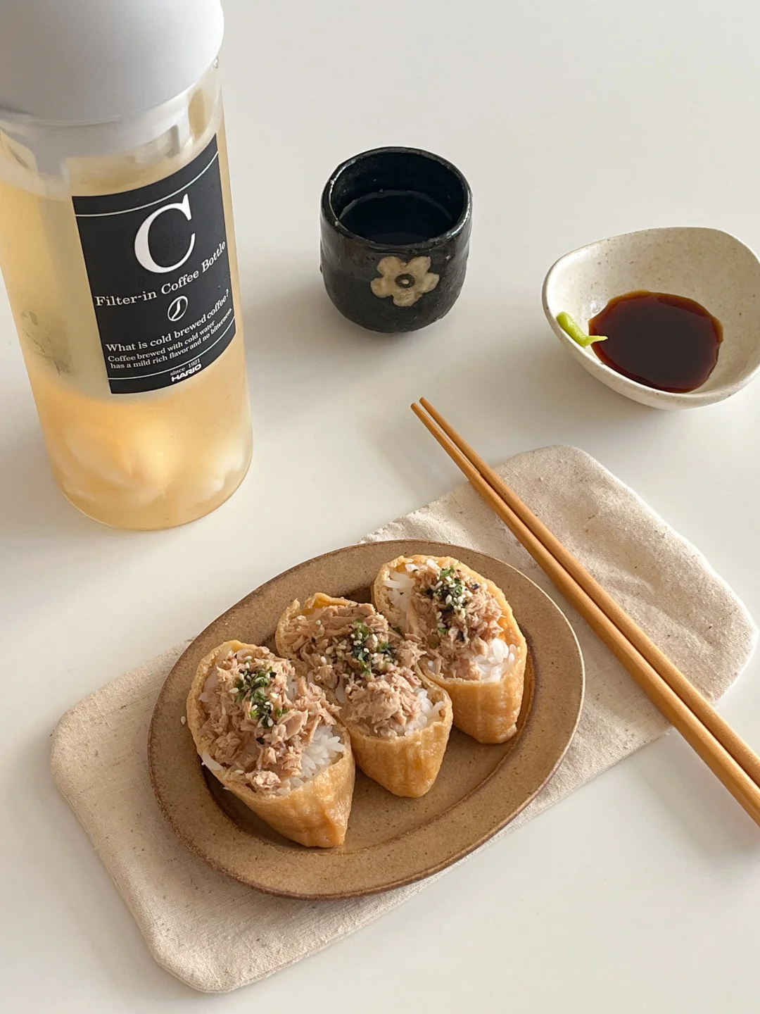 找到了消耗家里茶叶的好办法 就是做各式各样的冷泡茶🍵 现在是荔枝季 刚好是我最喜欢的 冷泡完的绿茶有淡淡的果香 不涩口 今天的饭: 麻油鸡肉鱿鱼饭🐙 炸土豆泥沙拉火腿片🍘 豆腐裙带菜味增汤🍥 冷泡荔枝绿茶🍵