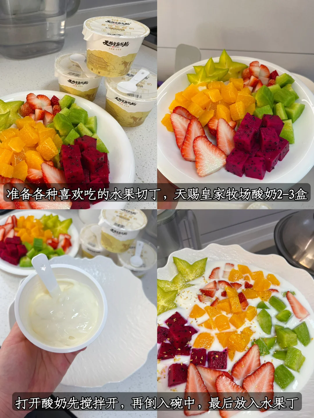 水果清洗切丁,从冰箱拿出三盒天赐皇家牧场莫提斯酸奶,再搭配一起拌成水果捞,一口满足~