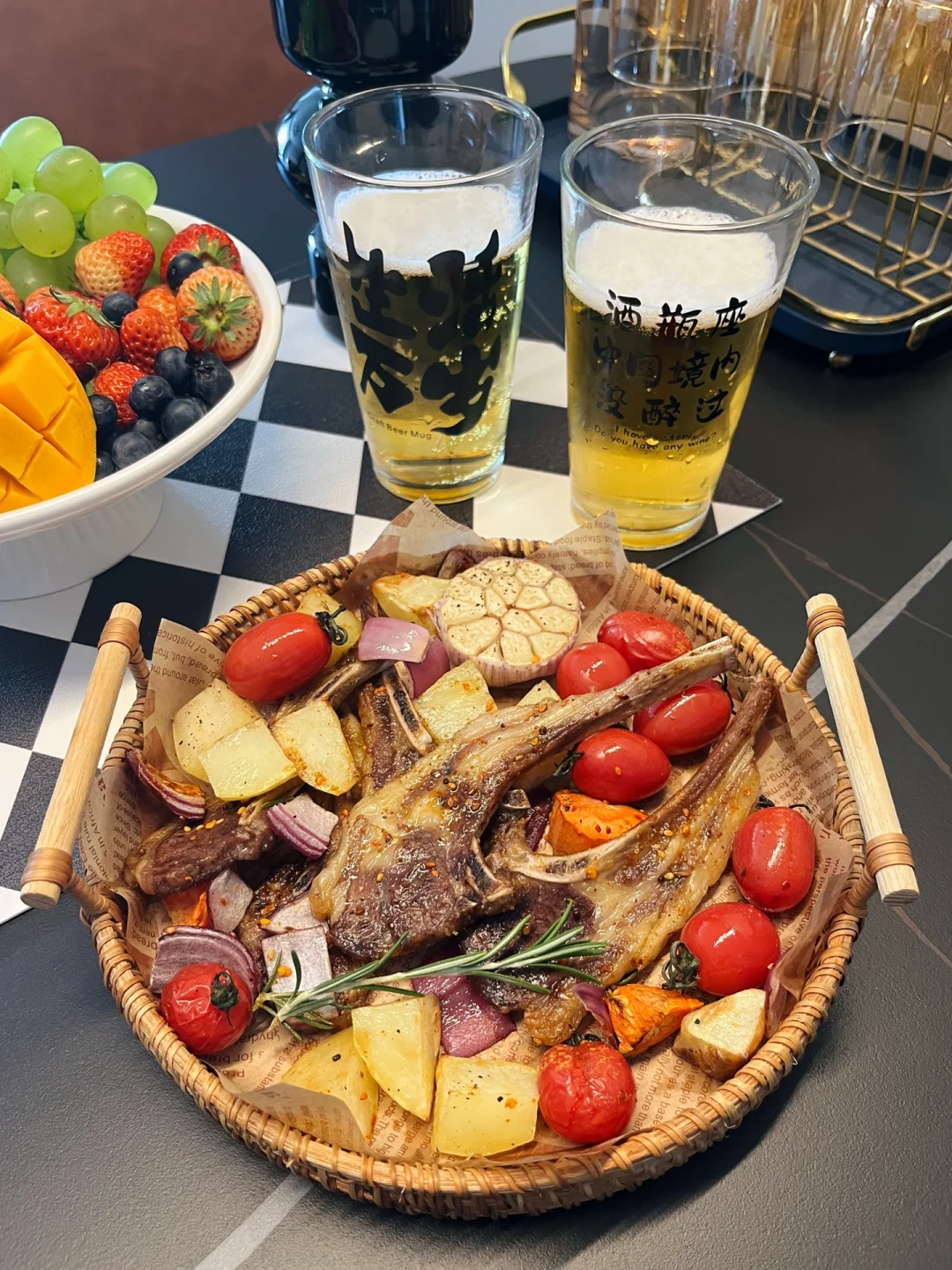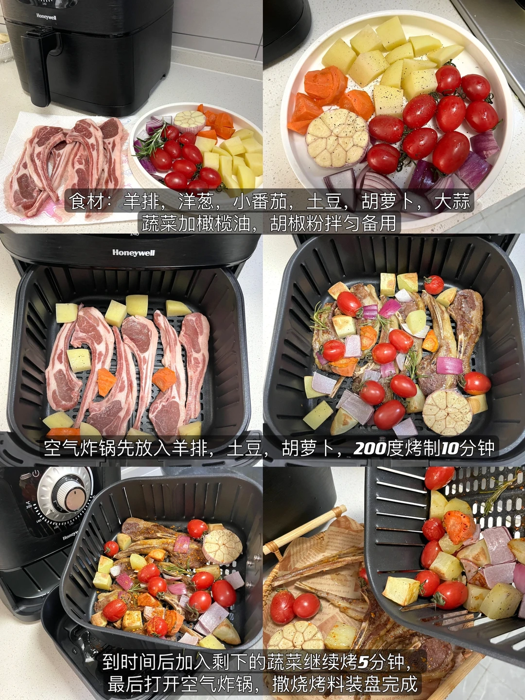 【战斧小羊排】:羊排提前解冻后放入空气炸锅,配上自己喜欢的小蔬菜,烤熟后可以沾上黑胡椒酱或者烧烤调料都可以~香迷糊