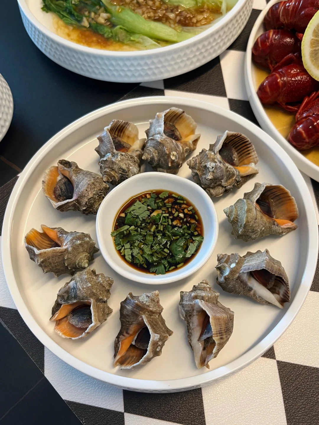 【白灼海螺】:早上去买菜的时候看到海螺,确实也很久没吃了,22块钱买了一斤回来直接蒸熟搭配白灼汁就可以啦~
