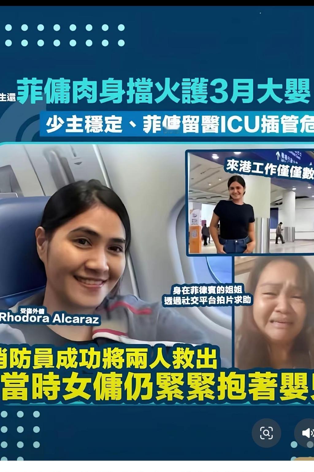 [微风]香港这名菲佣火了!她和雇主家三个月大的女婴一同困在火场。菲佣放弃逃生,保护三月婴儿。最终,她们成功等到了救援。 生死之间的抉择往往只在这一瞬间,作为求生本能,面对近在咫尺的逃生通道,所有人下意识的反应都是冲出去,但对于刚来香港不久的艾卡雷兹来说,那个还没被热浪完全封住的出口,都比不上屋里另一边传来的那点微弱气息来得重要。 这本来是属于她独自逃生的最佳窗口期,烈火在公寓里急速乱窜,还没等到烧穿门窗,她就已经意识到了巨大的危险。 可她是个刚到岗不久的菲佣,这并不是她生长的家,甚至那个正在摇篮里的三个月大女婴,也与她没有任何血缘关系,然而,在看到火舌的那一刻,她的脚步没有任何犹豫,甚至都没有多看那个逃生门一眼,直接转身,逆着本能冲向了深处的婴儿房。 由于火势太猛,常规的求救路径全都断了,雇主的电话始终处于无人接听的状态,在这绝望的孤岛里,信号成了唯一的稻草。 很难想象当时的她是怀着怎样颤抖的心情,在这个狭小的斗室里,将那条跨越国境的求救视频发给了远在菲律宾的姐姐。 屏幕那一端,看到的是一张满是烟灰惊恐万状的脸,听到的全是撕心裂肺的喊着“救救孩子”;而屏幕这一端,为了换取救援的时间,远在菲律宾的亲人疯狂地在社交网络呼喊,最终才惊动了香港消防处。 当这十多分钟漫长得像一个世纪过去,消防员破拆入户时,眼前的景象足以让铁汉落泪,这不是两个人,这简直就是一座沉默的“肉盾雕像”,艾卡雷兹整个人极度蜷缩在墙角死角,后背完全敞开暴露在高温和浓烟之下,那一块的衣物早已焦黑一片。 在如此极限的高温环境里,她怀里的那一方小天地却是湿润而安全的,原来在昏迷前,她把自己能找到的所有生机都给了雇主家的孩子——唯一的湿毛巾,被她小心翼翼地捂在了宝宝的口鼻处,而她自己,没有任何防护,用最原始的血肉之躯,硬生生替孩子扛下了身后所有的烈火与浓烟。 这一场生命交换的代价是惨痛的,被抬上担架时,满身烫伤、头发烧焦的她甚至已经神志不清,却还在呢喃着那句刻入骨髓的“先救孩子”。 结果如她所愿,那个三个月大的小生命,除了受到一些惊吓,身上连一点伤痕都没有,反观艾卡雷兹,肺部吸入性损伤严重,直接被推进了ICU抢救。 在这场无妄之灾面前,所有的身份标签都显得苍白,雇主守在重症监护室外早已泣不成声,抓着医生的手一遍遍哀求救救这位“恩人”。 当艾卡雷兹插着呼吸管终于转醒,第一句拼尽力气问出的话,依然不是关心自己还得在这个陌生城市躺多久,而是虚弱地询问那个小家伙怎么样了。 这原本只是一个为了给远在家乡的父母筹措医药费、才不得不背井离乡来打工的普通女孩,在没发生这一切之前,她不过是这所大房子里的过客。 如今,当雇主带着那个已经安全了的小宝宝去医院看她,小家伙隔着病床懵懂地伸出小手要抱抱时,这份跨越国界与血缘的链接才显得如此具象化。 信源:中华网香港火灾被困菲佣与幼儿已获救 二人平安脱险