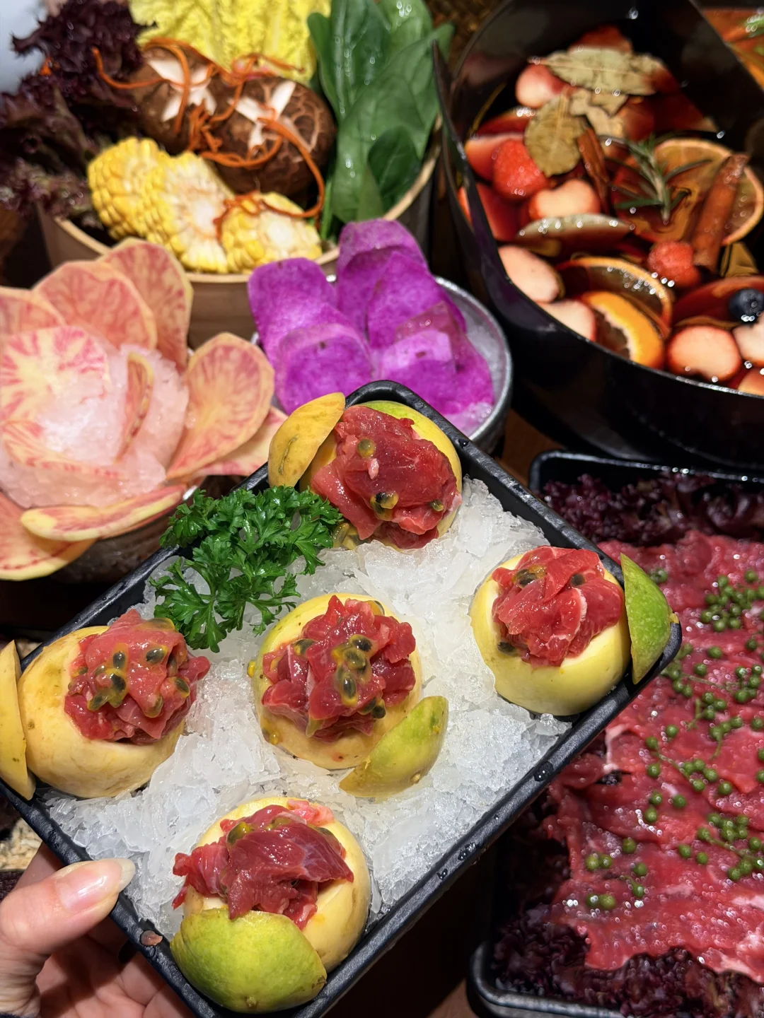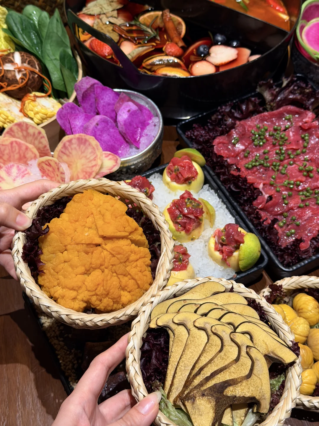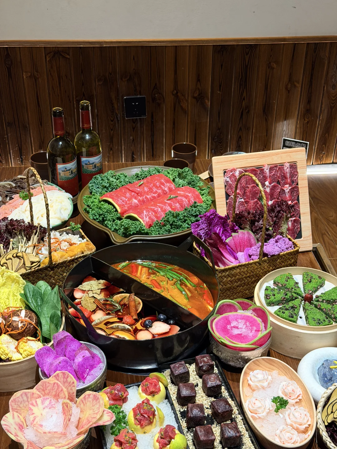 这是一种什么神仙的体验? 酸汤火锅➕热红酒锅🟰圣诞🧑🎄月治愈搭配 本人喝了好多年热红酒 绝不是黑暗料理 肉桂 🍊丁香➕🍷 带着果香和暖意 喝完浑身暖乎乎 菜品也是颜值和口味👍 紫色的花菜🥦第一次见 牛肝菌金耳口感新奇 黑米糍粑和红豆糕妥妥的中式甜品之光 这简直就是 🍷餐桌上的冬日浪漫❄️
