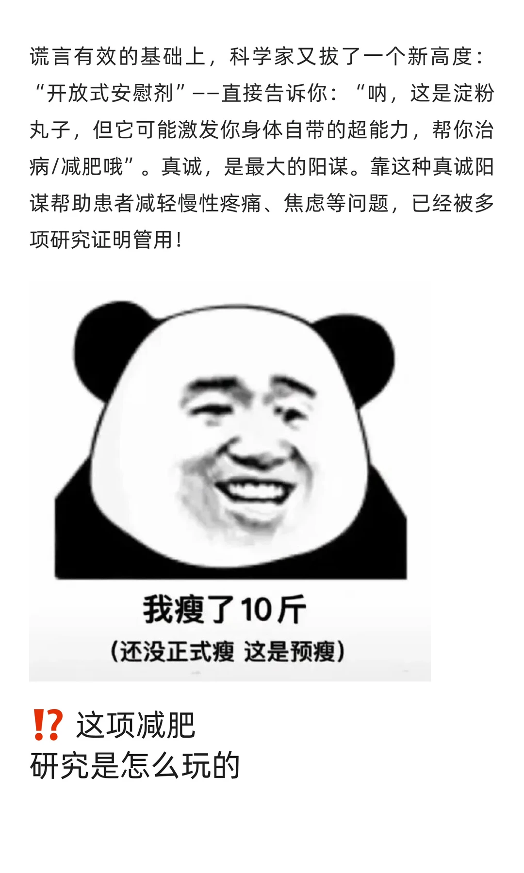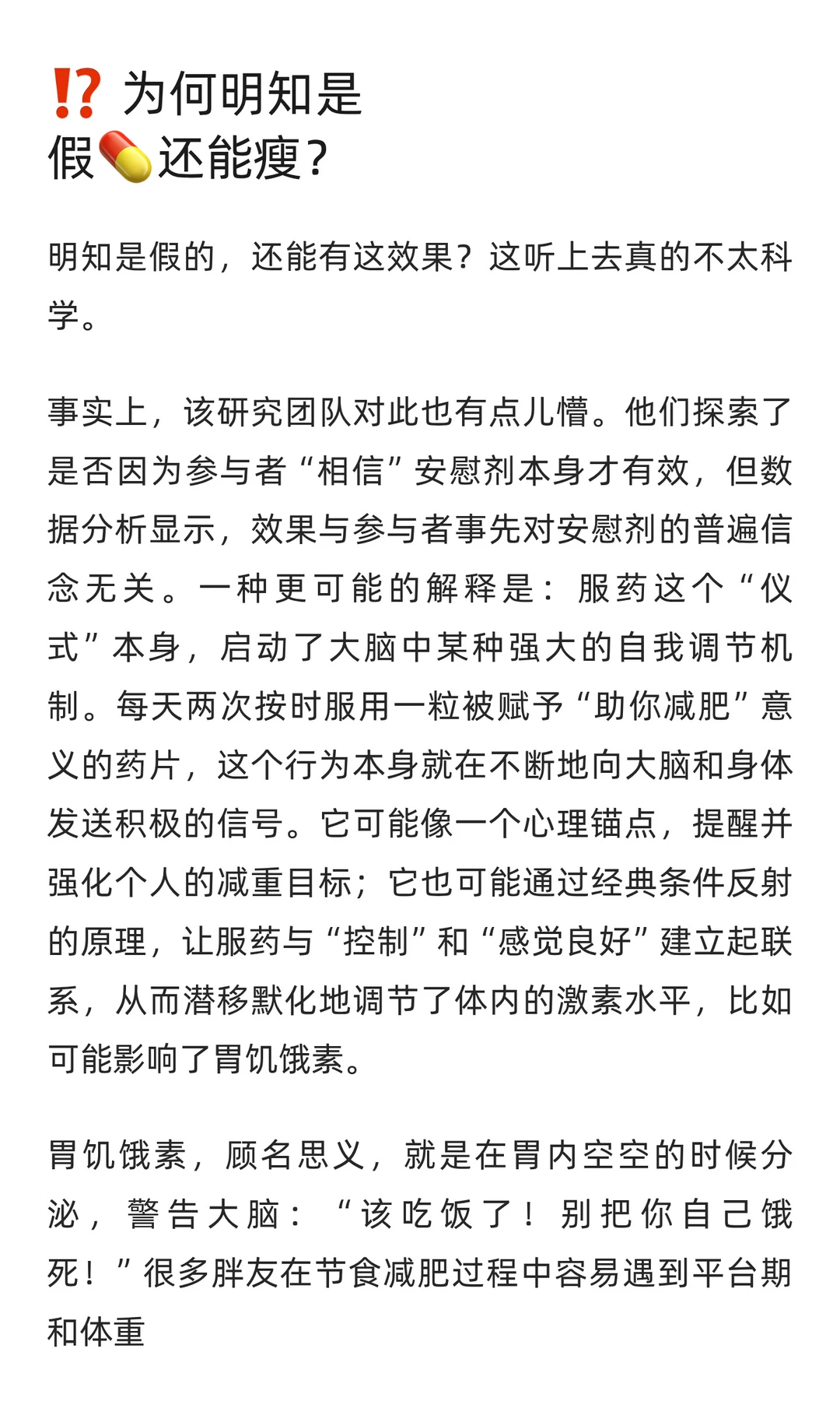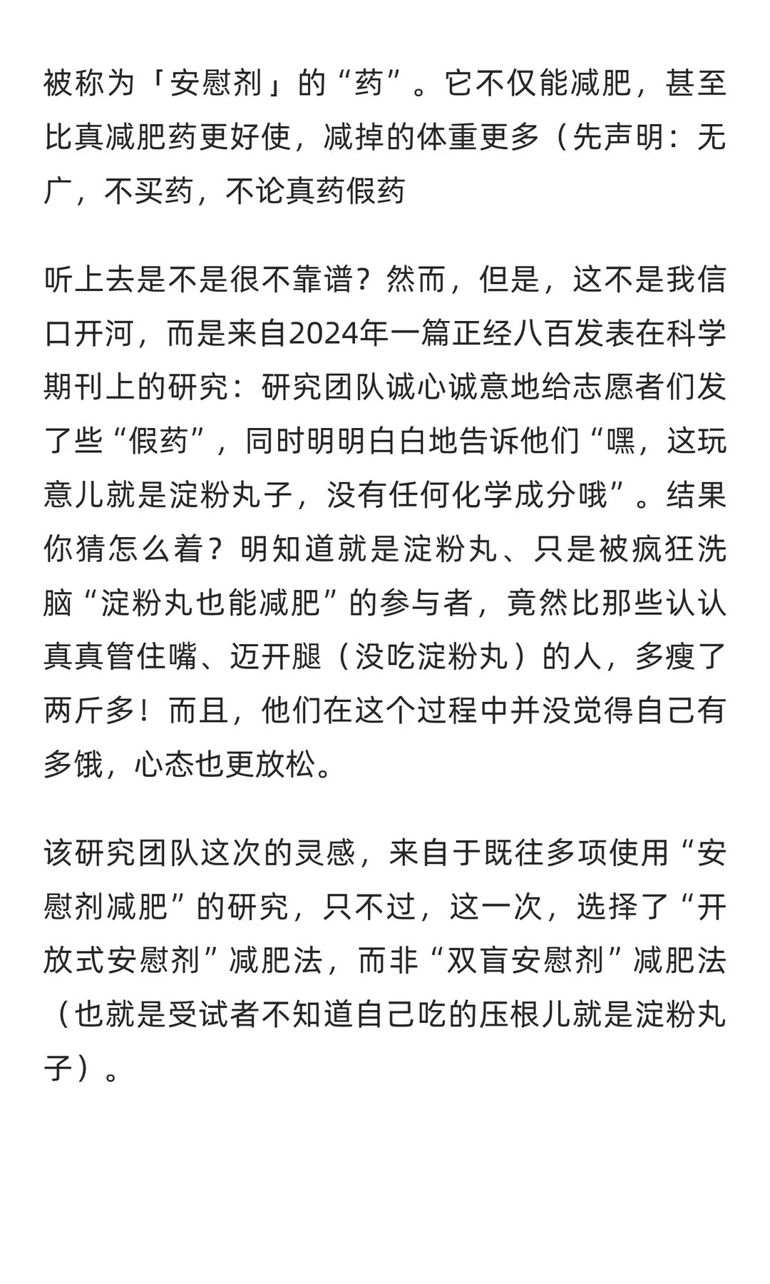揭秘神奇「安慰剂效应」,轻松甩肉不再是梦!💪 今天遂谦的健康方式 要给大家分享一个听起来有些“玄学”的方法:通过所谓的「安慰剂」来实现真正的减肥效果!🤔 可能有人会疑惑:安慰剂?那不是一种没有任何疗效的药吗?没错,它的成分极度安全(基本上等同于白开水),但在心理学上,它却能产生意想不到的效果。 更让人惊喜的是,研究表明,安慰剂甚至可能在某些情况下比真正的减肥药物更有效,更能帮助我们减轻体重!一起来了解下吧>>>>