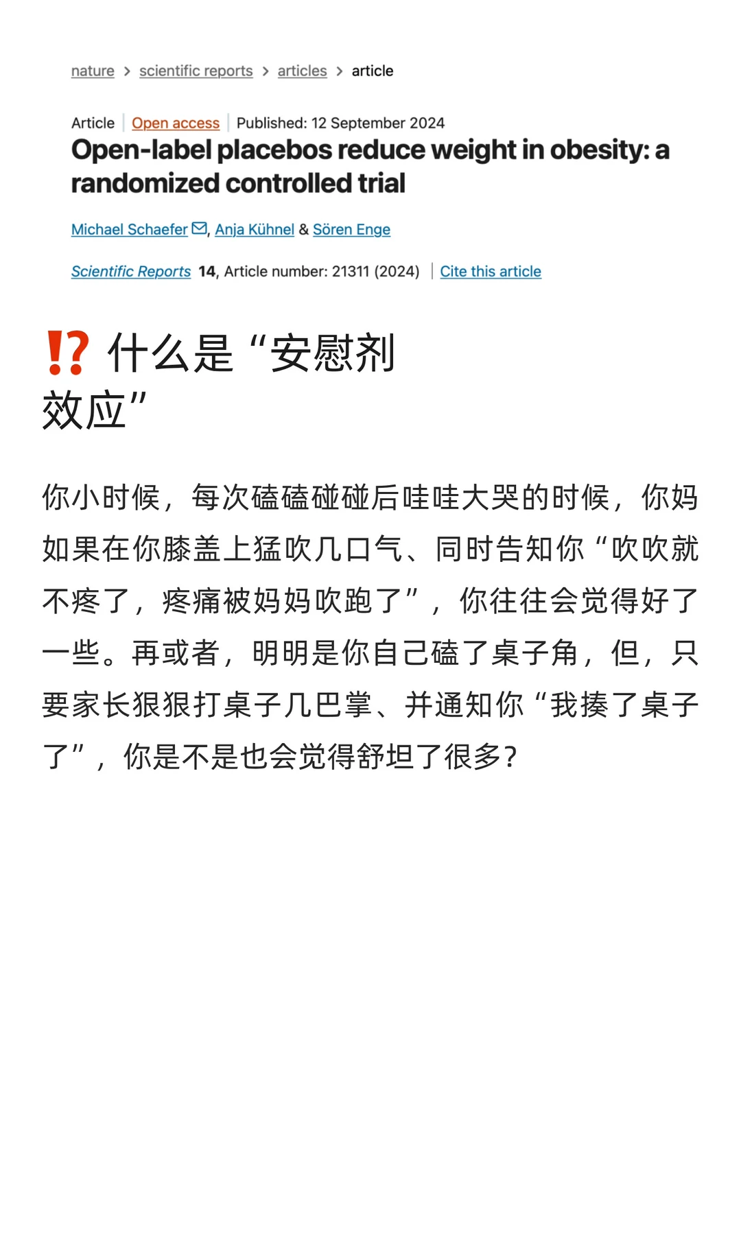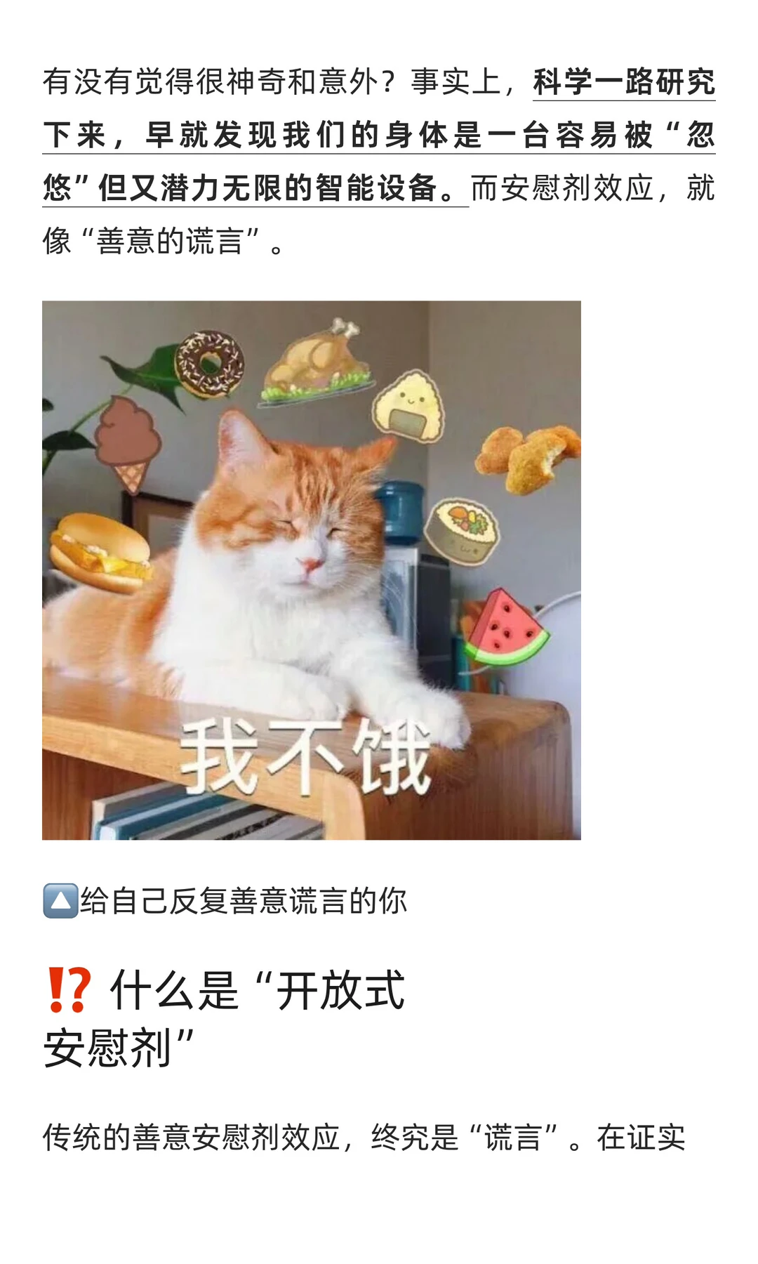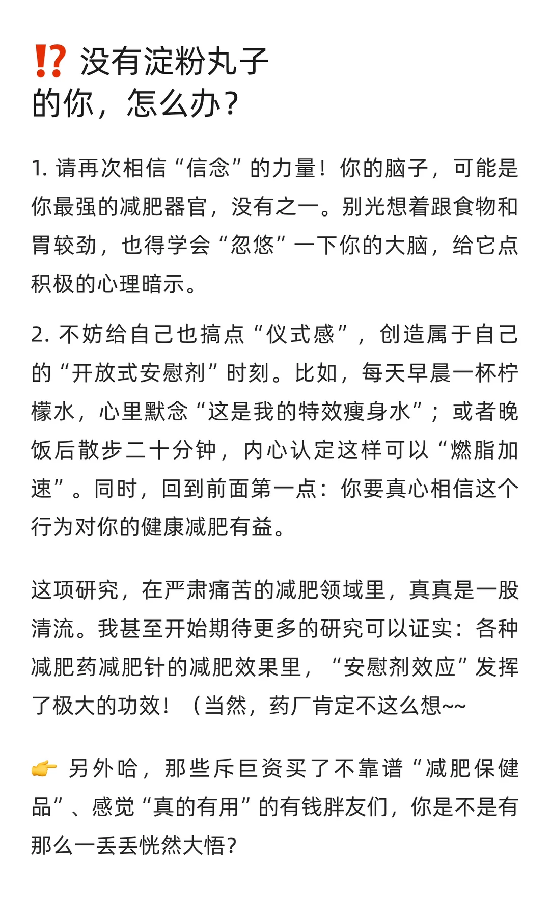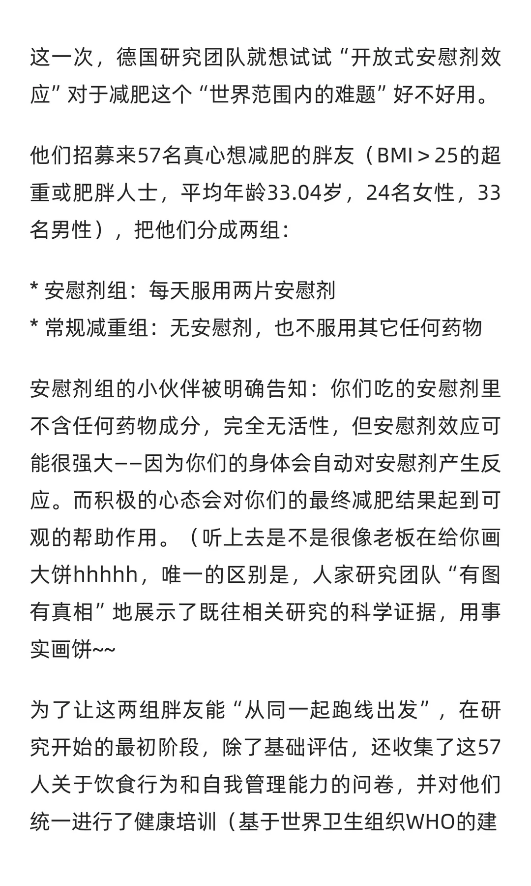揭秘神奇「安慰剂效应」,轻松甩肉不再是梦!💪 今天遂谦的健康方式 要给大家分享一个听起来有些“玄学”的方法:通过所谓的「安慰剂」来实现真正的减肥效果!🤔 可能有人会疑惑:安慰剂?那不是一种没有任何疗效的药吗?没错,它的成分极度安全(基本上等同于白开水),但在心理学上,它却能产生意想不到的效果。 更让人惊喜的是,研究表明,安慰剂甚至可能在某些情况下比真正的减肥药物更有效,更能帮助我们减轻体重!一起来了解下吧>>>>