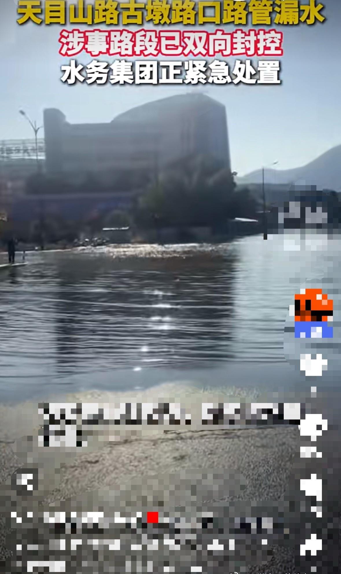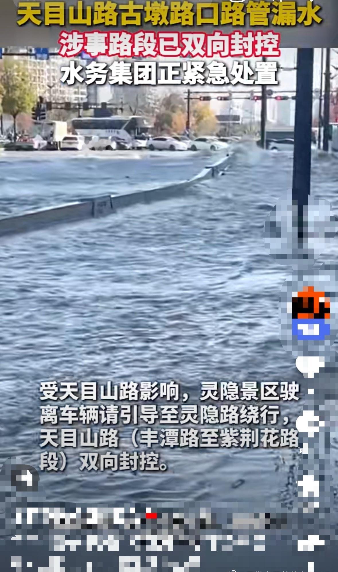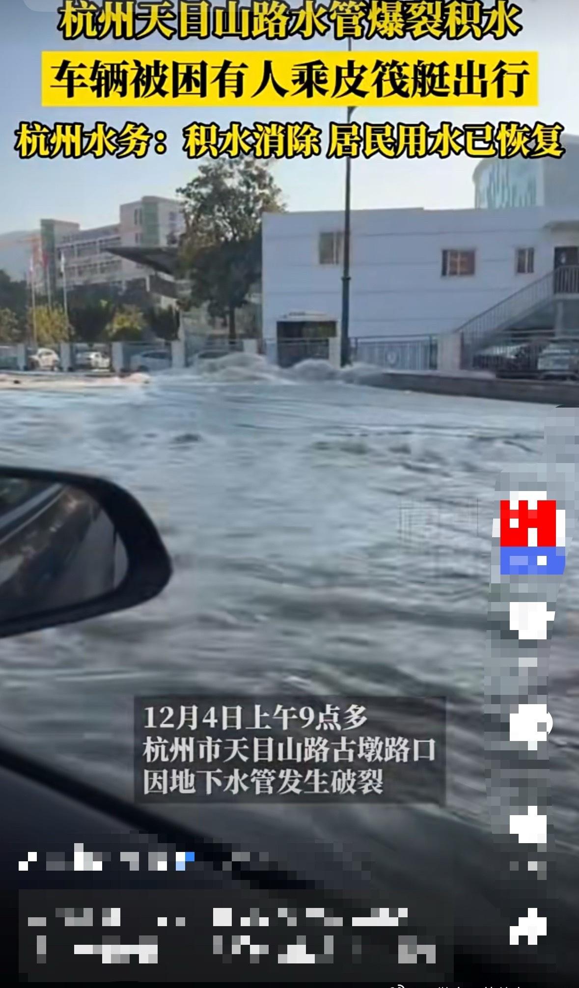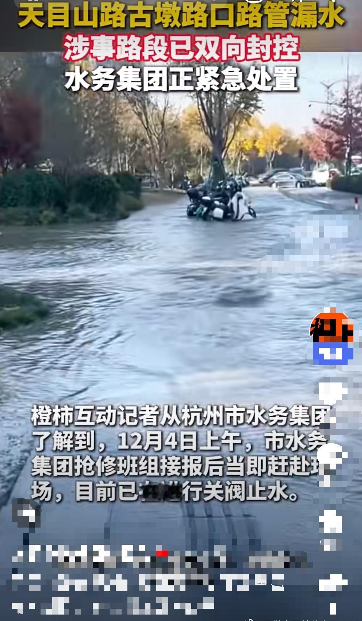 杭州天目山路古墩路口一带出现积水,有车辆车头被淹: 12月4日上午,‌杭州天目山路古墩路口‌因路管漏水出现严重积水,积水范围延伸至紫荆花路,最深处达五六十公分,导致多辆汽车被淹。交警已对天目山路(丰潭路至紫荆花路段)实施双向封控,建议车辆绕行西溪路、文三路。市水务集团接报后已进行关阀止水,交警、水务、城管等多部门介入处置。‌‌ 据目击者描述,积水范围很大,“从古墩路一直到快接近紫金港路,全是水。”他表示,现场积水最深处估计有五六十公分,已导致多辆汽车被淹。“随手就看到一家4S店门口的车被淹了,应该有不少车受到影响。”现场已有多个部门介入处置,“交警、水务、城管的人员都在。” 12月4日上午9时15分,市水务集团接报天目山路古墩路口发生路管漏水。市水务集团抢修班组当即赶赴现场,目前已在进行关阀止水。后续情况将跟进通报。